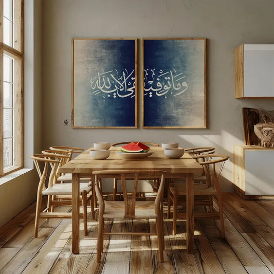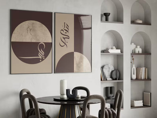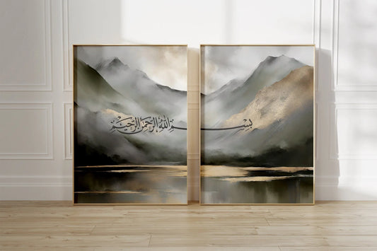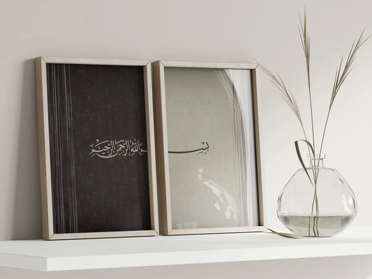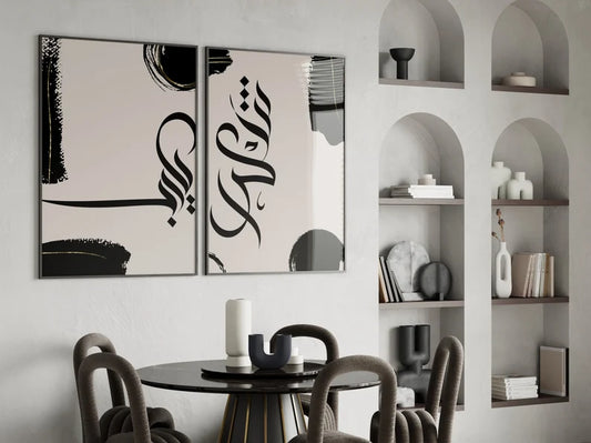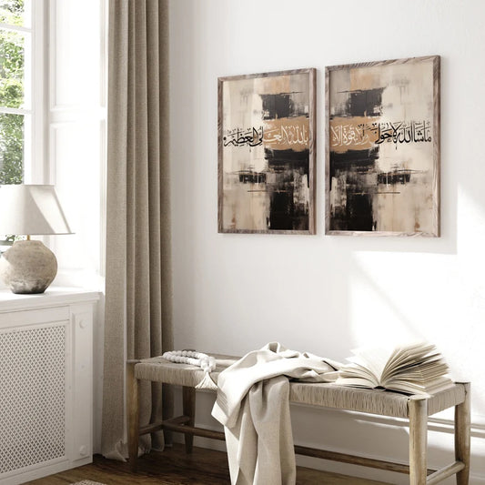 Diptyque islamique moderne – Calligraphie arabe sur fond abstrait beige et noir