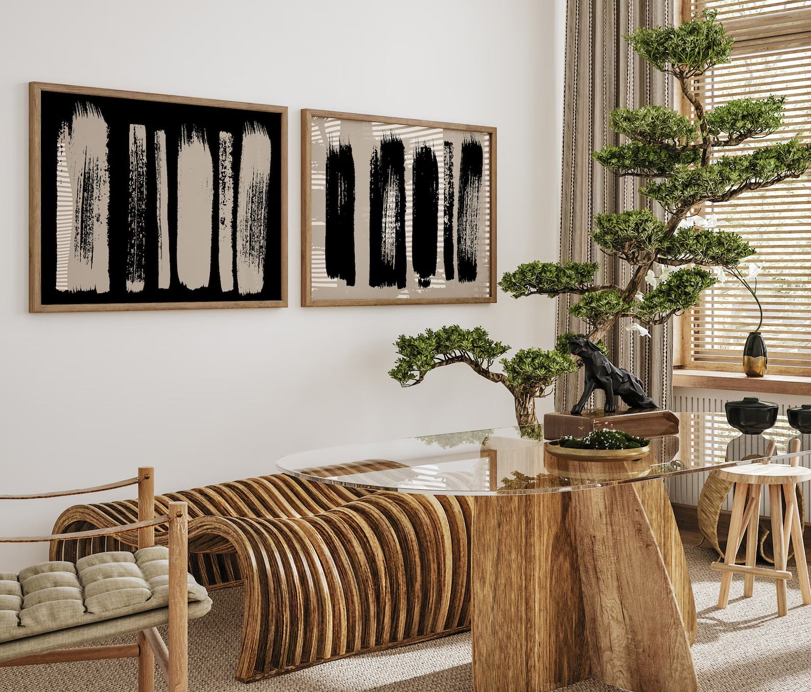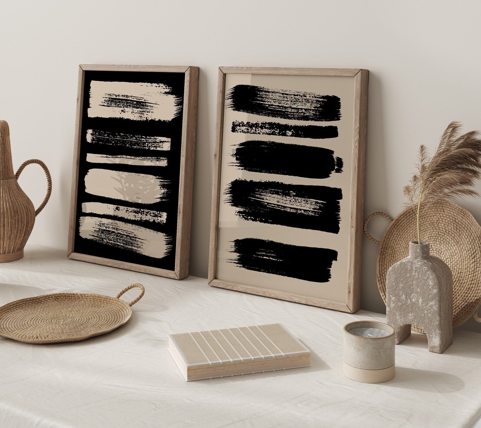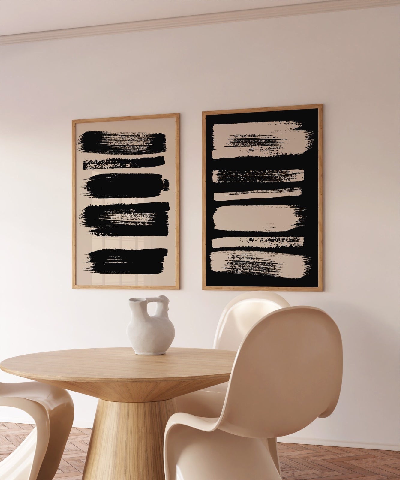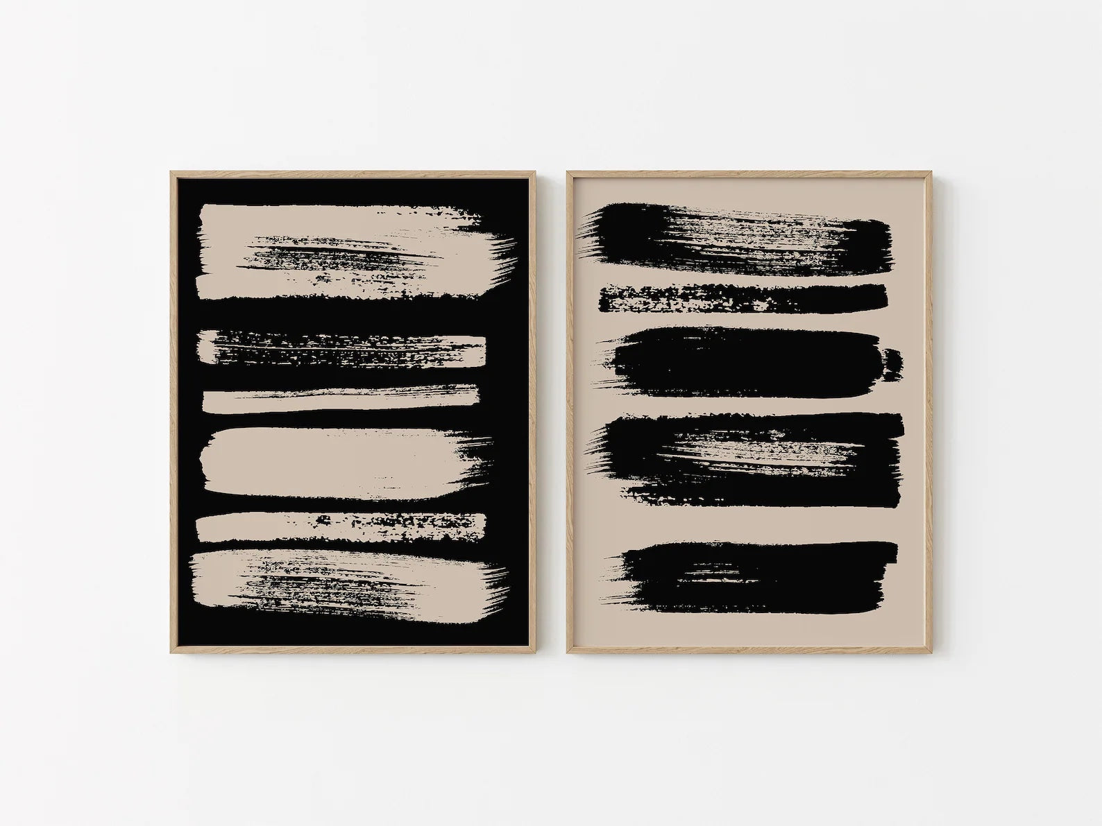 Ce duo minimaliste capture la beauté du mouvement instinctif : des traits de pinceaux bruts, presque primitifs, qui semblent figer le rythme d’une respiration ou le battement d’un cœur. Une parfaite harmonie entre force et silence, dans des teintes neutres et profondes.