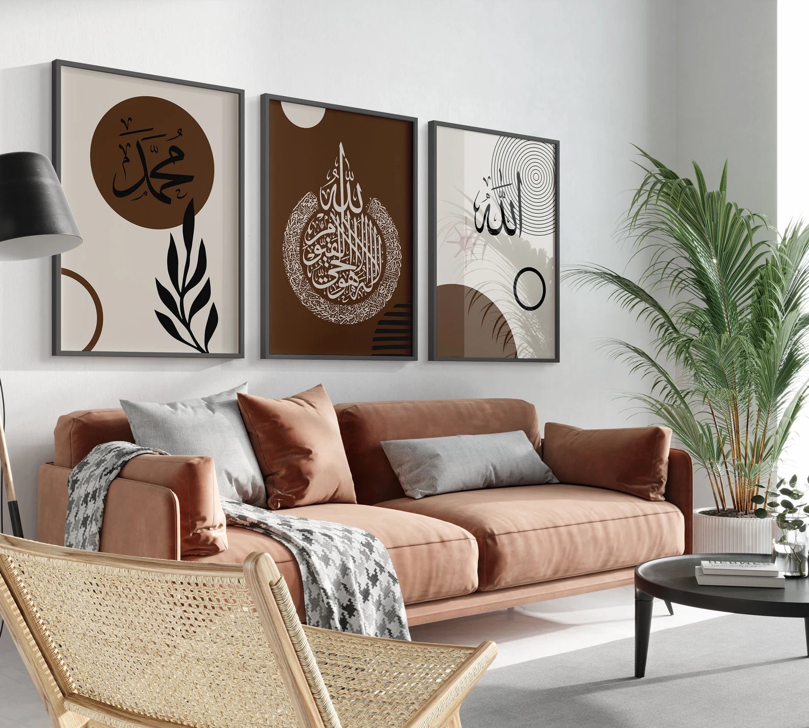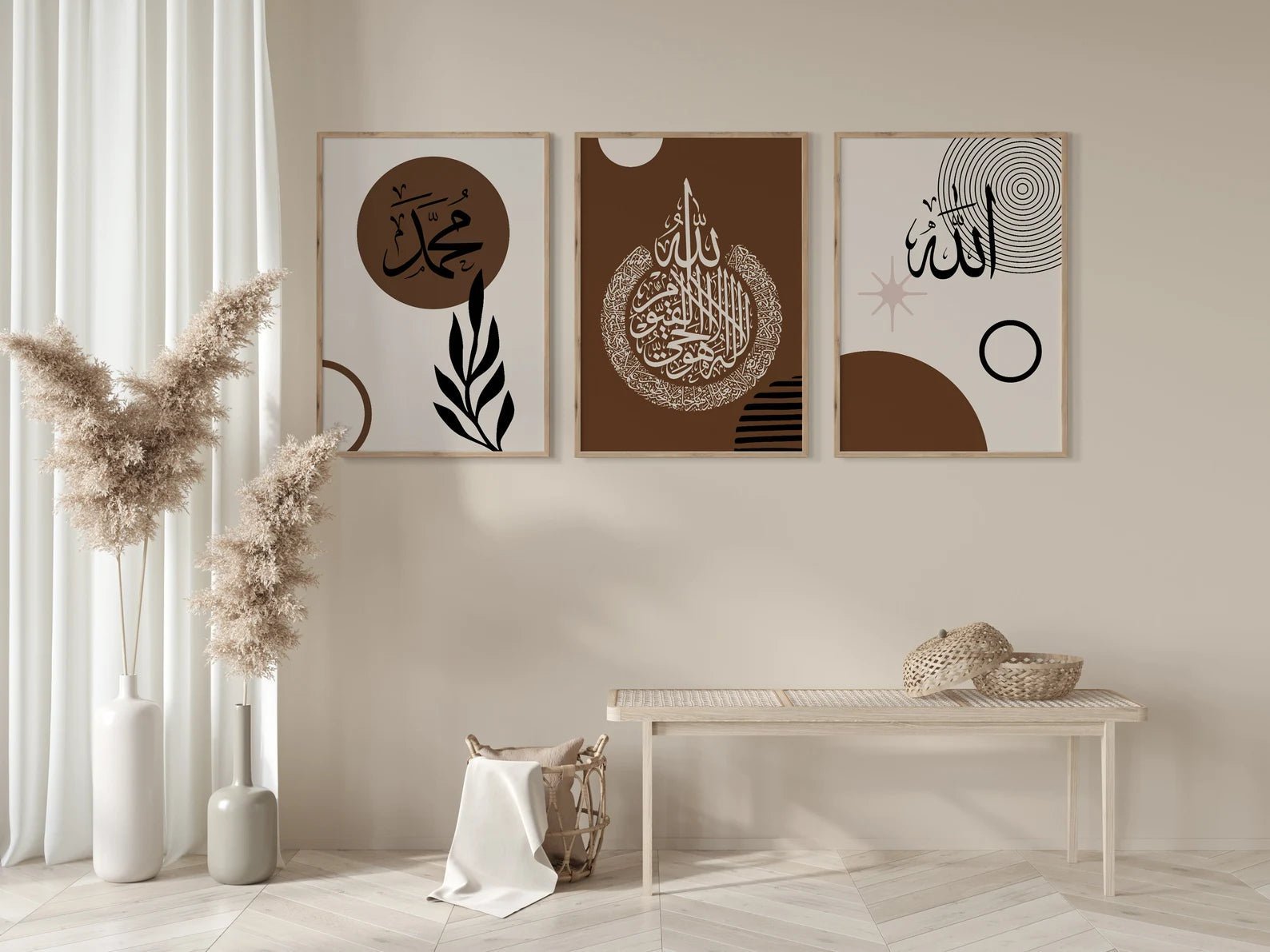 Apportez une touche spirituelle et contemporaine à votre intérieur avec cet ensemble de trois affiches murales islamiques, mettant en valeur la calligraphie arabe élégante des noms sacrés “Allah” et “Muhammad”, ainsi qu’un magnifique cercle calligraphié. Les tons chauds marron et beige, associés à des formes géométriques minimalistes, s’intègrent parfaitement dans une décoration moderne, scandinave ou bohème.