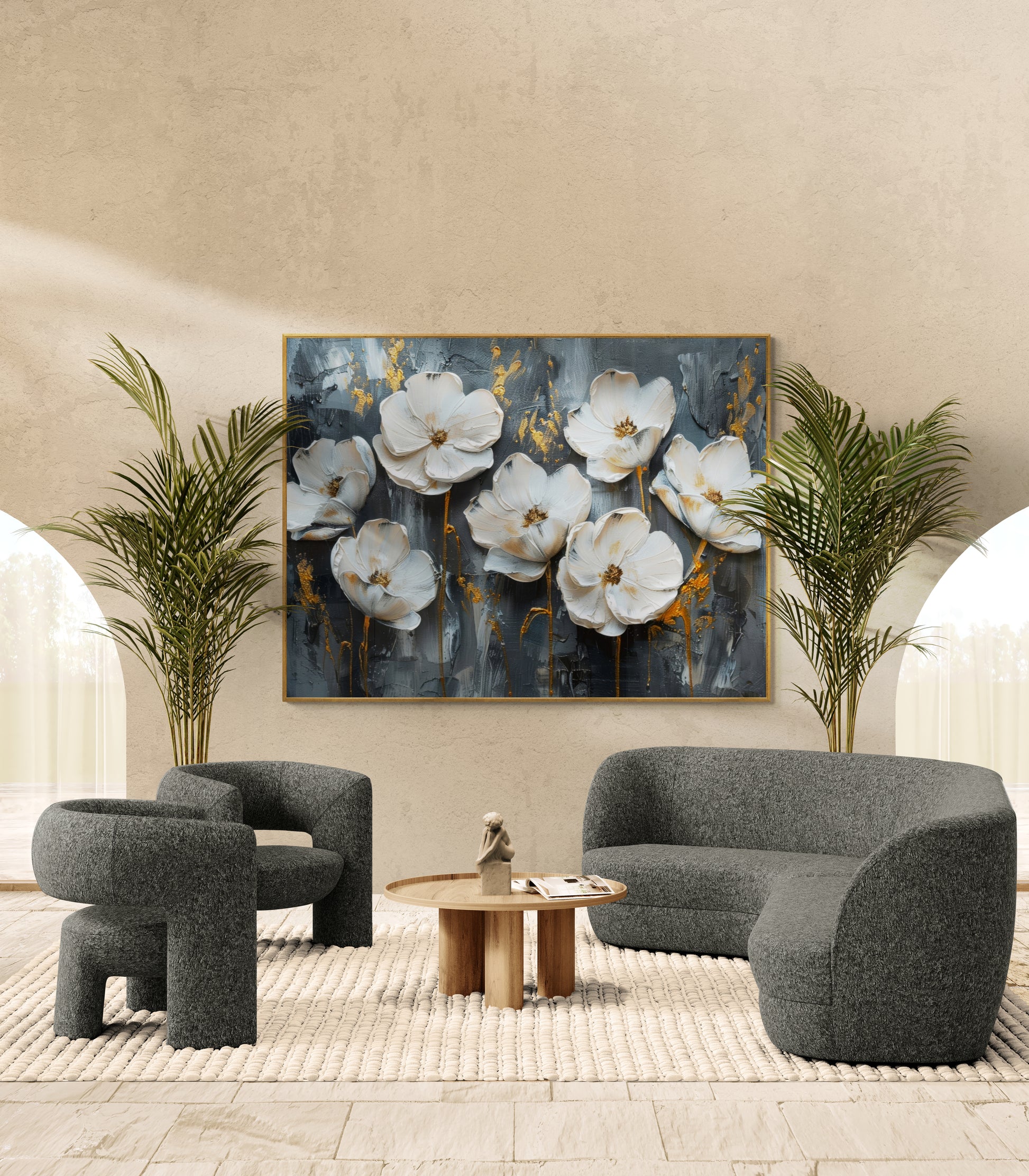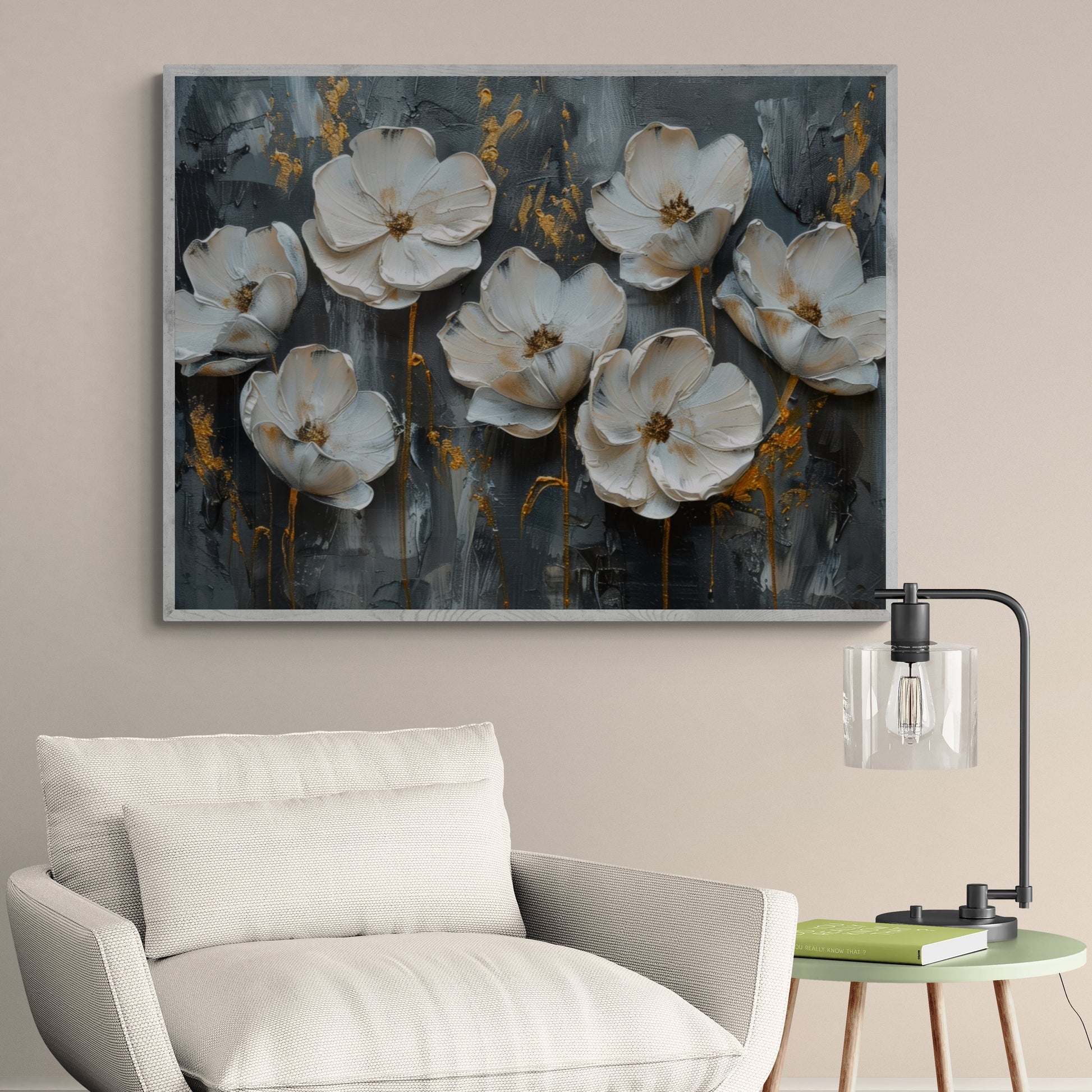 Plongez dans l’élégance mystérieuse d’Éclosion Nocturne, un tableau floral saisissant où de délicates fleurs blanches s’épanouissent avec grâce sur un fond texturé aux teintes charbon. Chaque pétale peint avec relief semble sortir du cadre, apportant une touche artistique vivante et luxueuse à votre pièce.