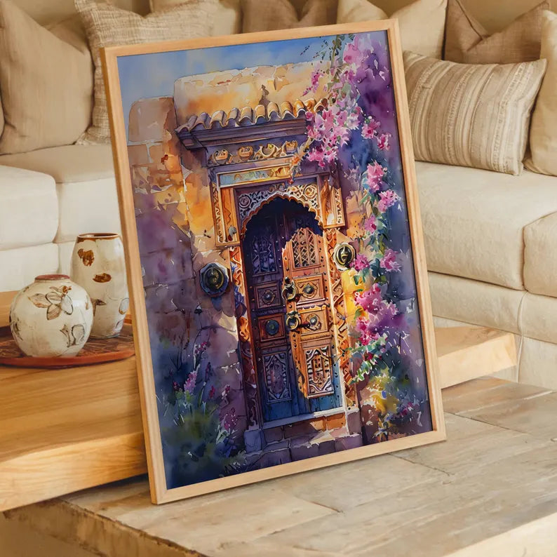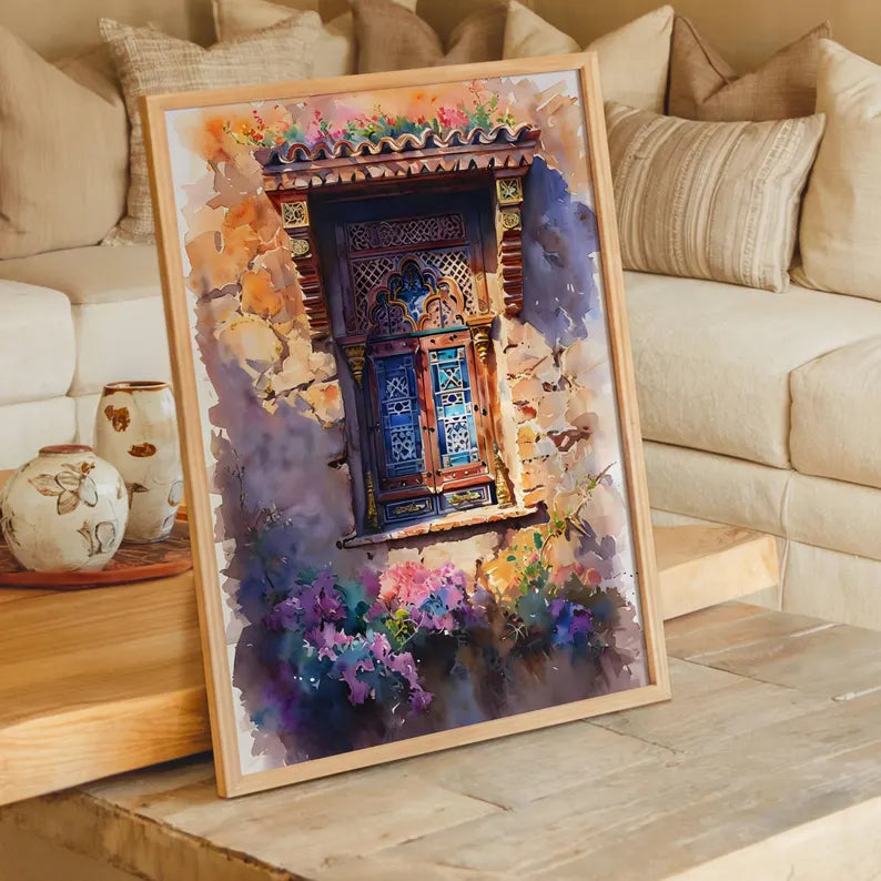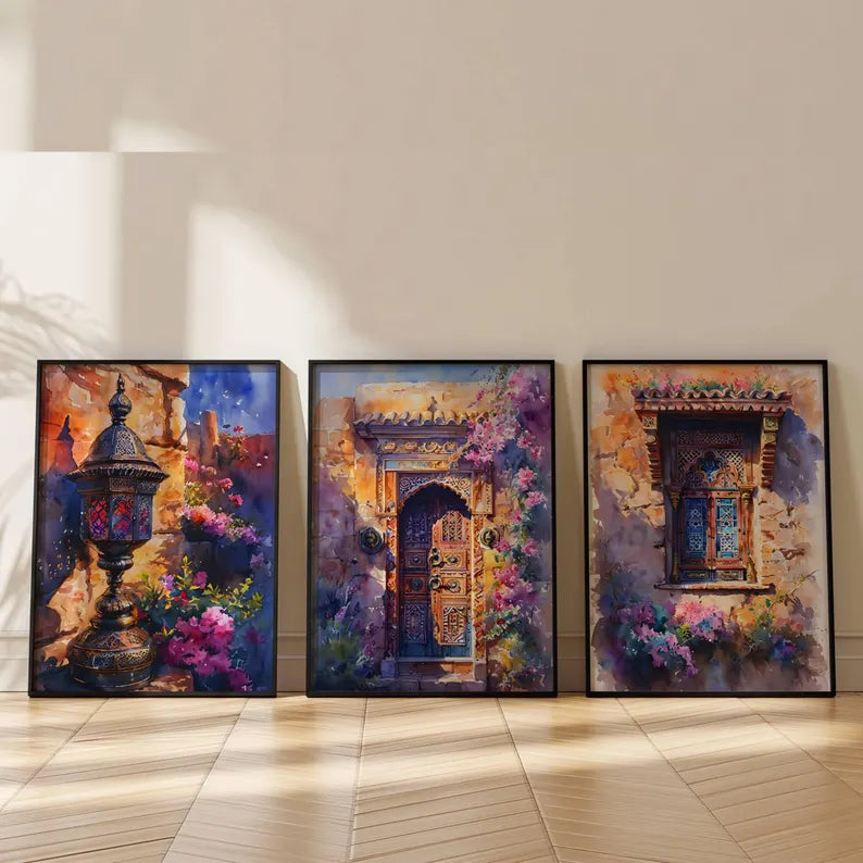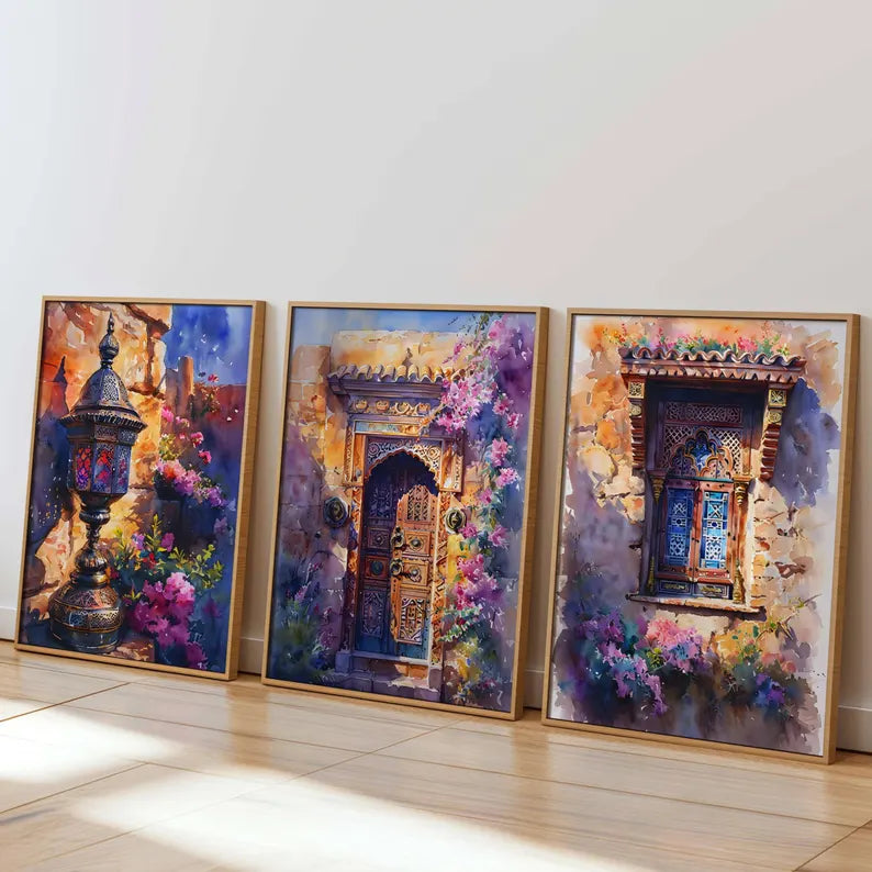 Entrez dans l’univers poétique et vibrant de la ville d’Essaouira à travers cette collection de tableaux inspirés par son architecture authentique, ses détails sculptés, et ses éclats de lumière. Chaque pièce évoque l’atmosphère apaisante de cette cité côtière, où les portes anciennes, les fenêtres décorées et les lanternes orientales se mêlent à la végétation florissante.
