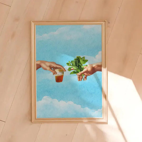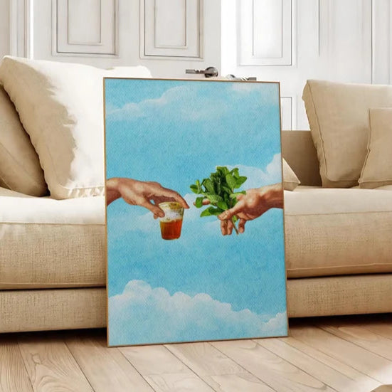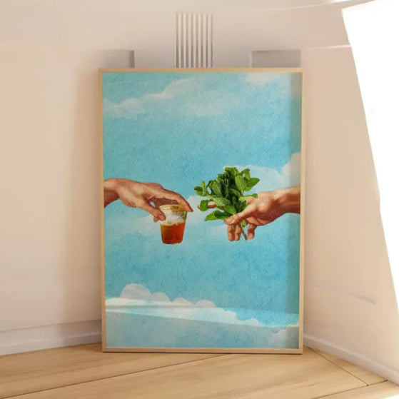 Quand l’art sacré rencontre l’humour marocain, cela donne naissance à une création aussi céleste que décalée ! Inspirée de "La Création d’Adam" de Michel-Ange, cette affiche revisite la scène iconique avec une touche 100% marocaine : une main divine tendant un verre de thé à la menthe brûlant, pendant qu’une autre lui offre un bouquet de menthe fraîche.