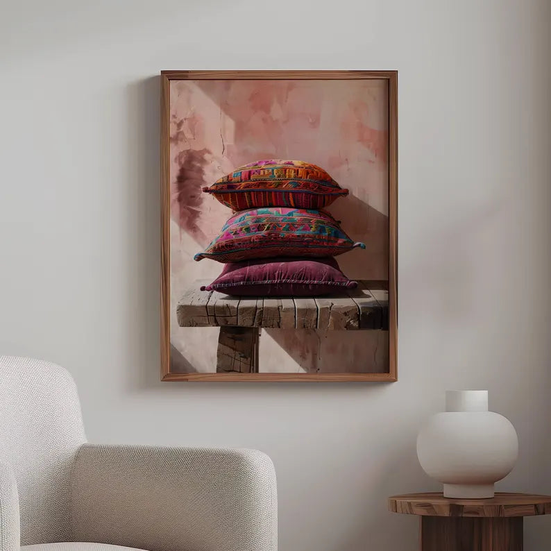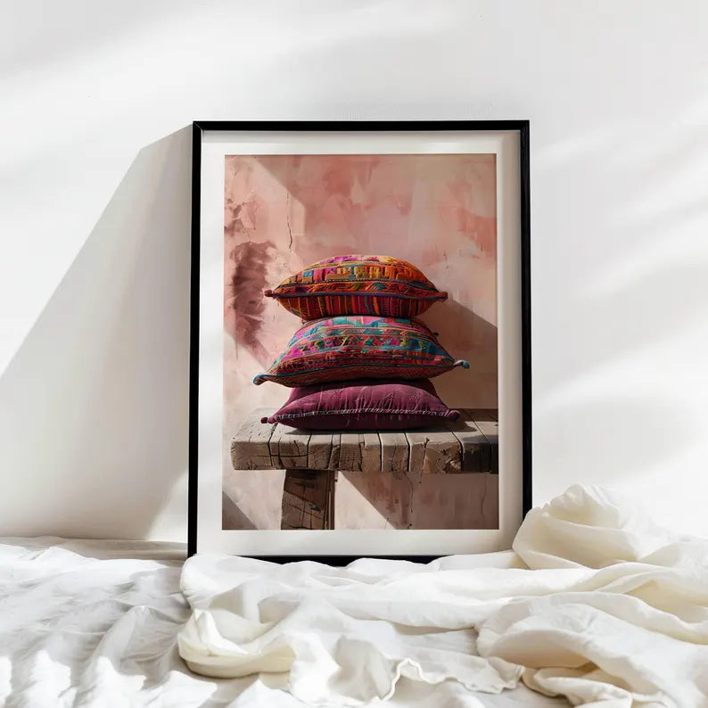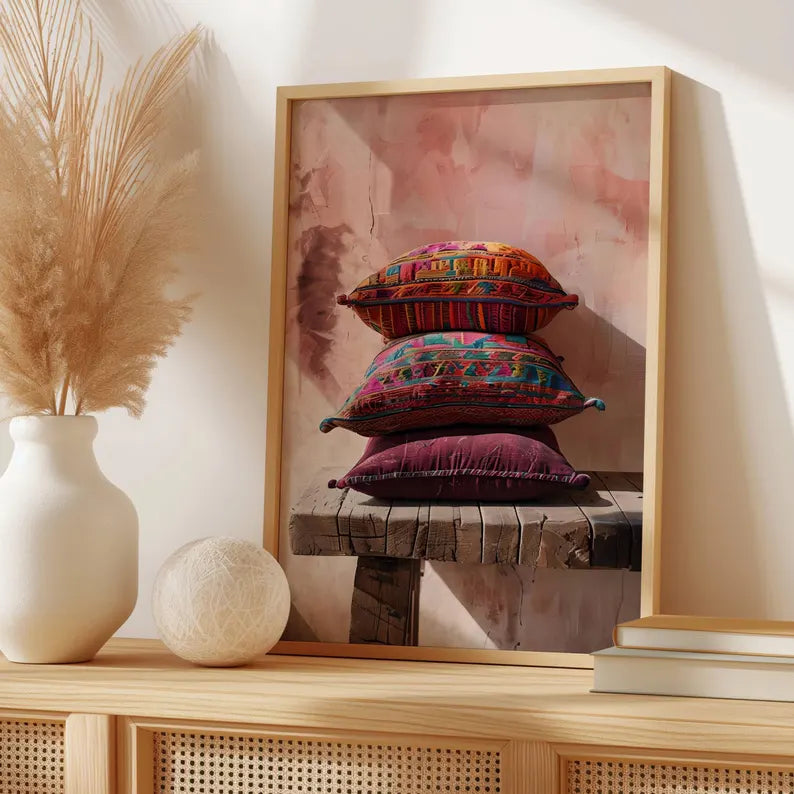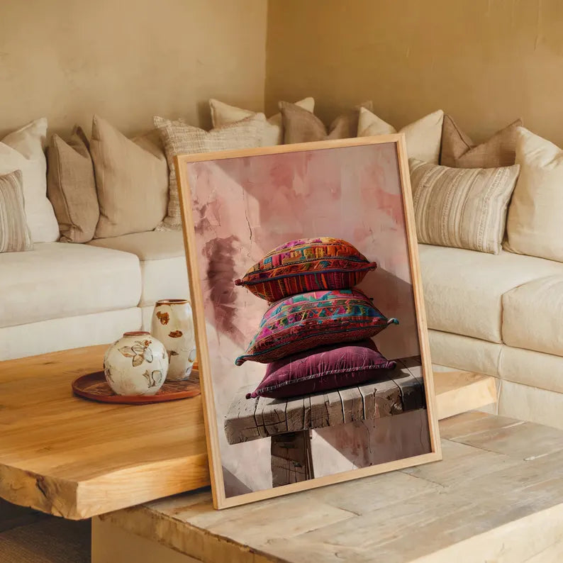 Ce tableau artistique présente trois magnifiques coussins berbères empilés avec soin sur une table en bois brut, devant un mur aux tons rose terre cuite. Chaque coussin arbore des motifs traditionnels marocains, tissés avec des couleurs vibrantes, évoquant le savoir-faire artisanal du Maroc et l’esprit chaleureux de ses intérieurs.