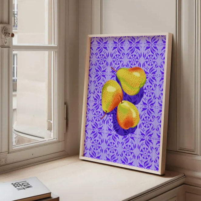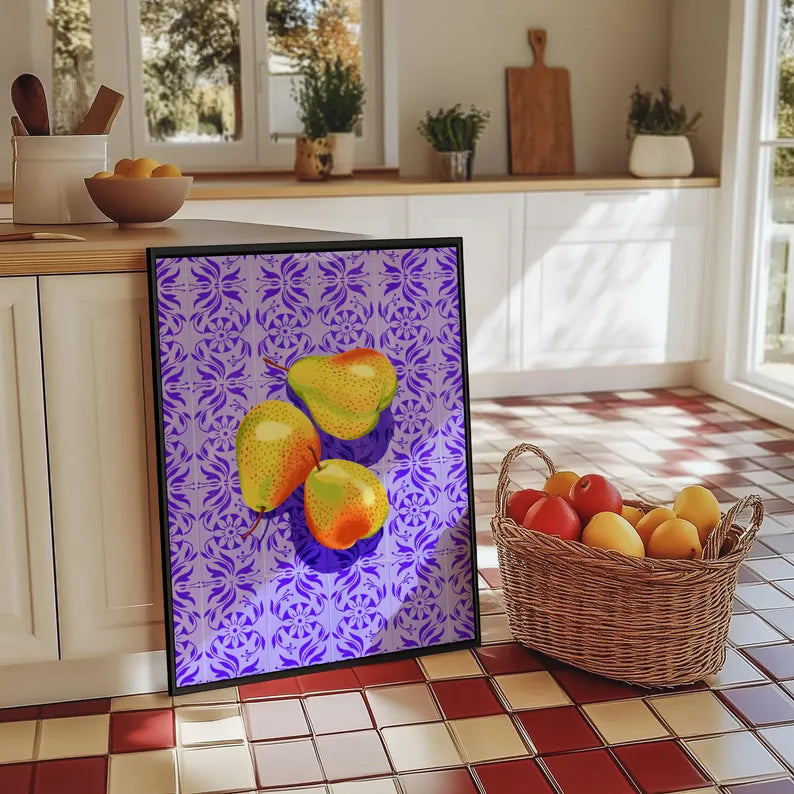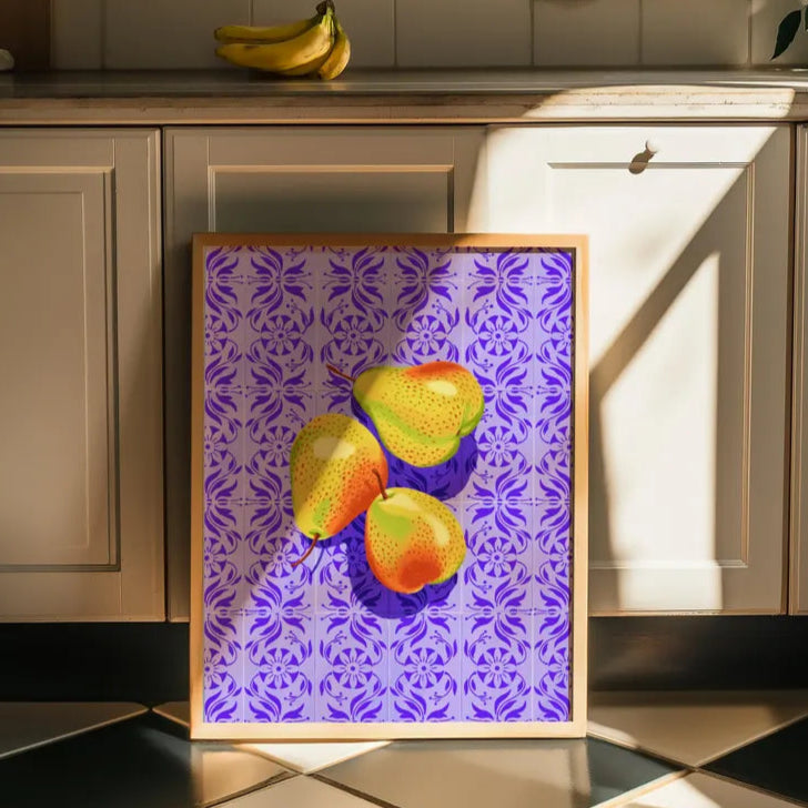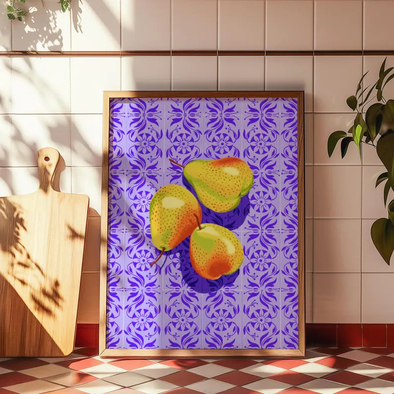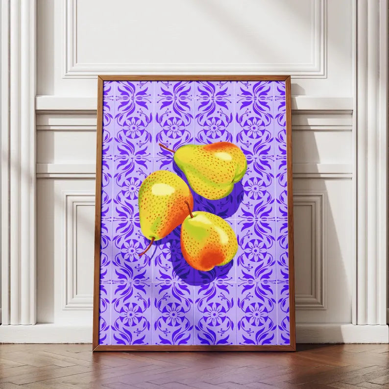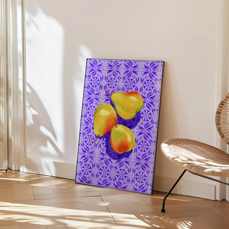 Ce tableau captivant met en scène trois poires juteuses aux teintes dorées et orangées, reposant sur un fond violet orné de motifs inspirés des carreaux traditionnels. L’harmonie entre la douceur des fruits et l'intensité du décor mauve crée une œuvre pop et méditerranéenne qui attire immédiatement l'œil.