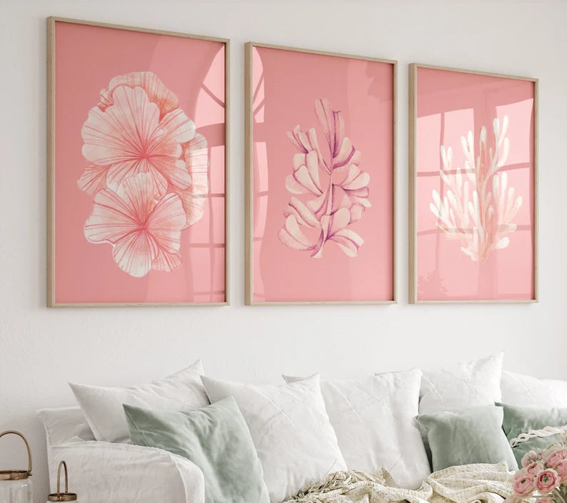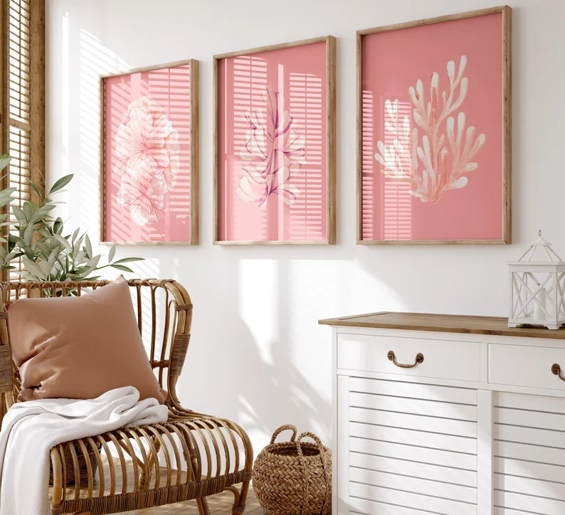Les teintes rosées, à la fois lumineuses et délicates, se marient parfaitement avec des intérieurs modernes, scandinaves ou bohèmes. Que ce soit dans un salon, une chambre ou un espace de détente, ce triptyque attire le regard et apporte un éclat chaleureux à votre décoration.