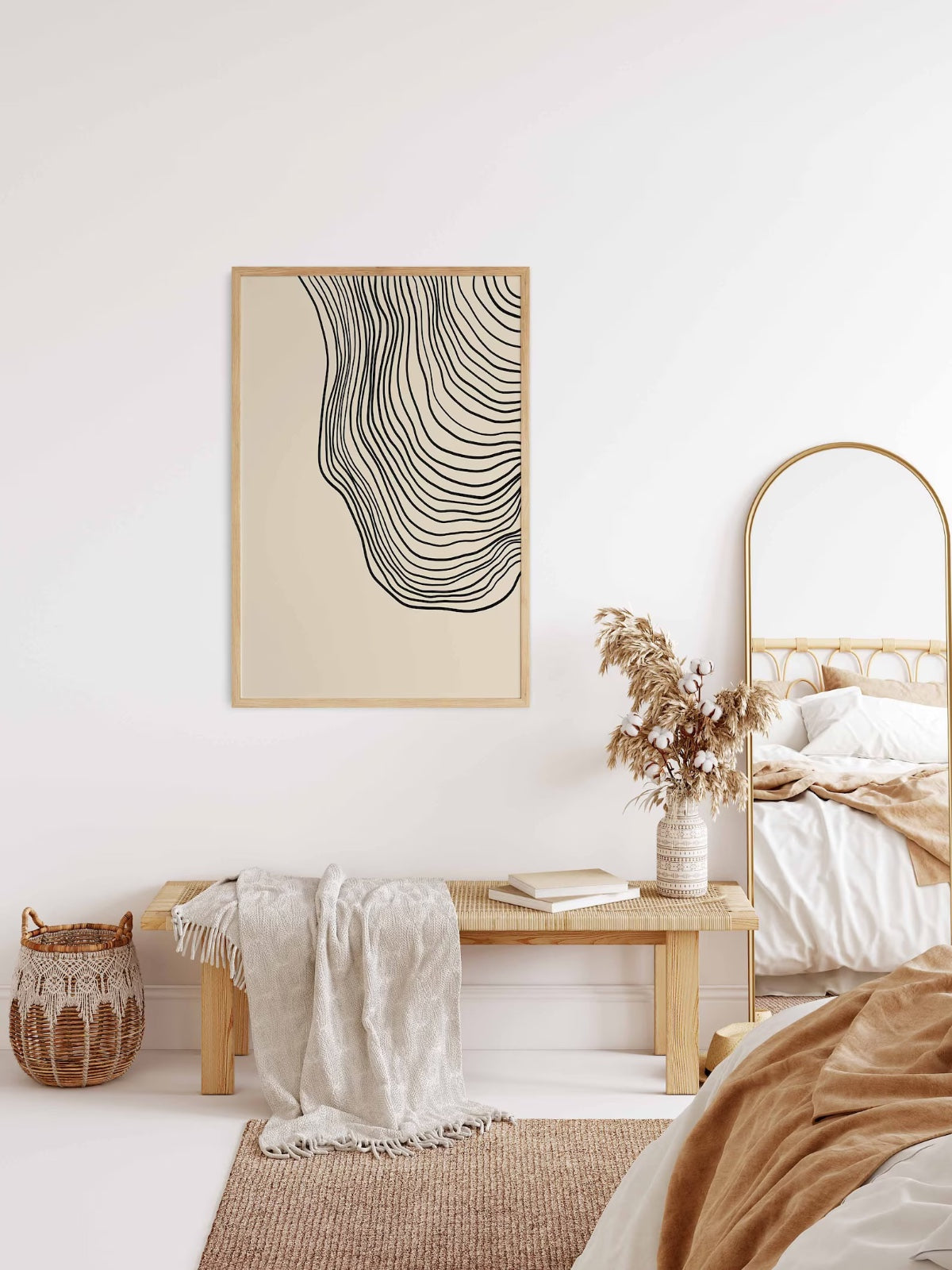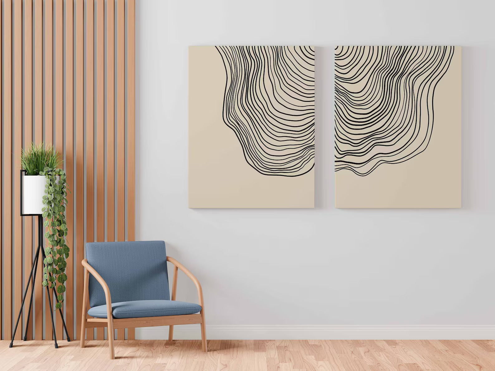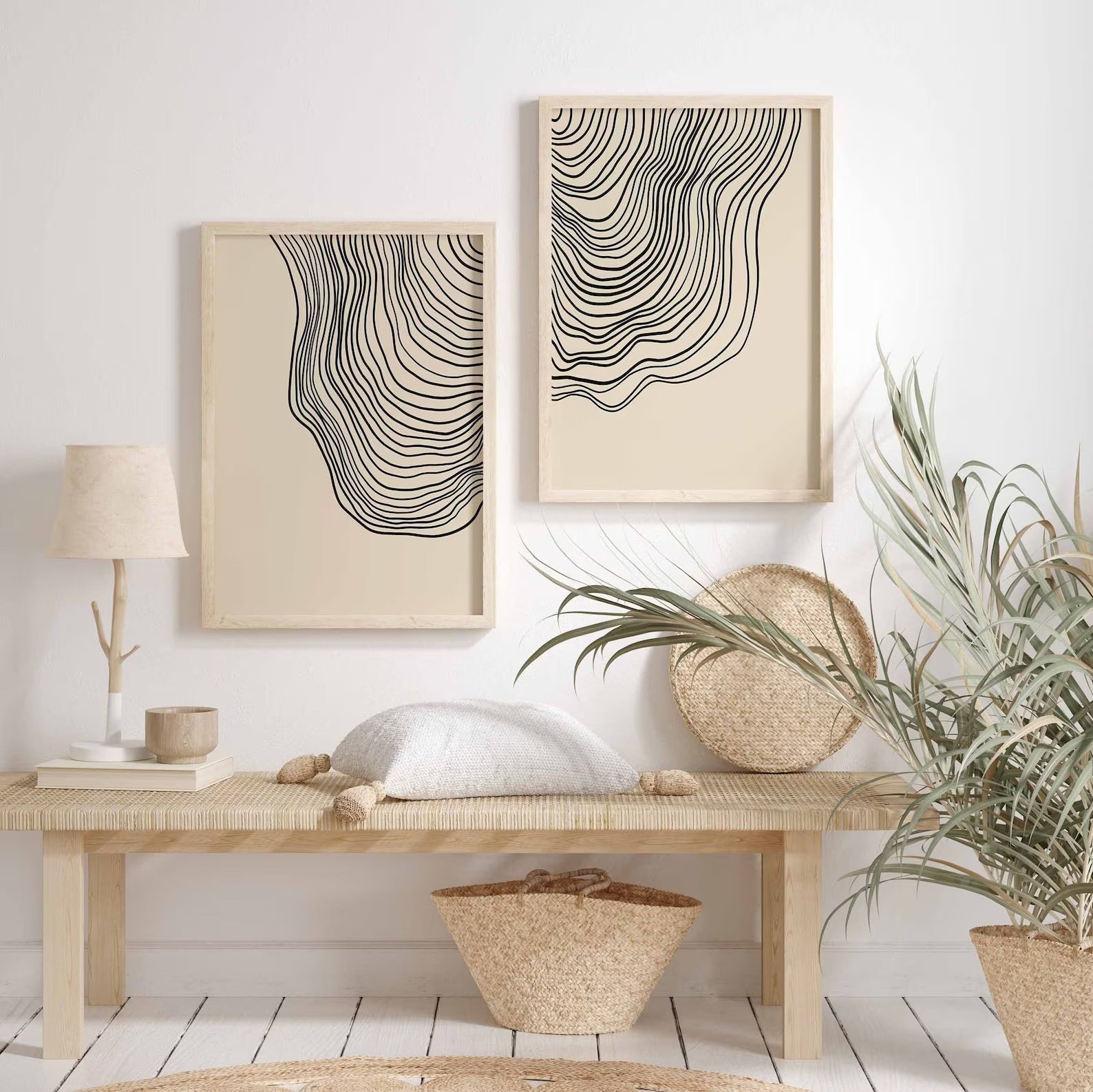 Avec leurs courbes douces et organiques, ces deux tableaux incarnent la fluidité du calme, comme des vagues sonores suspendues dans le temps. Lignes fines, mouvements subtils, et fond sable apaisant — une combinaison parfaite pour les amateurs de minimalisme chic et de poésie visuelle.