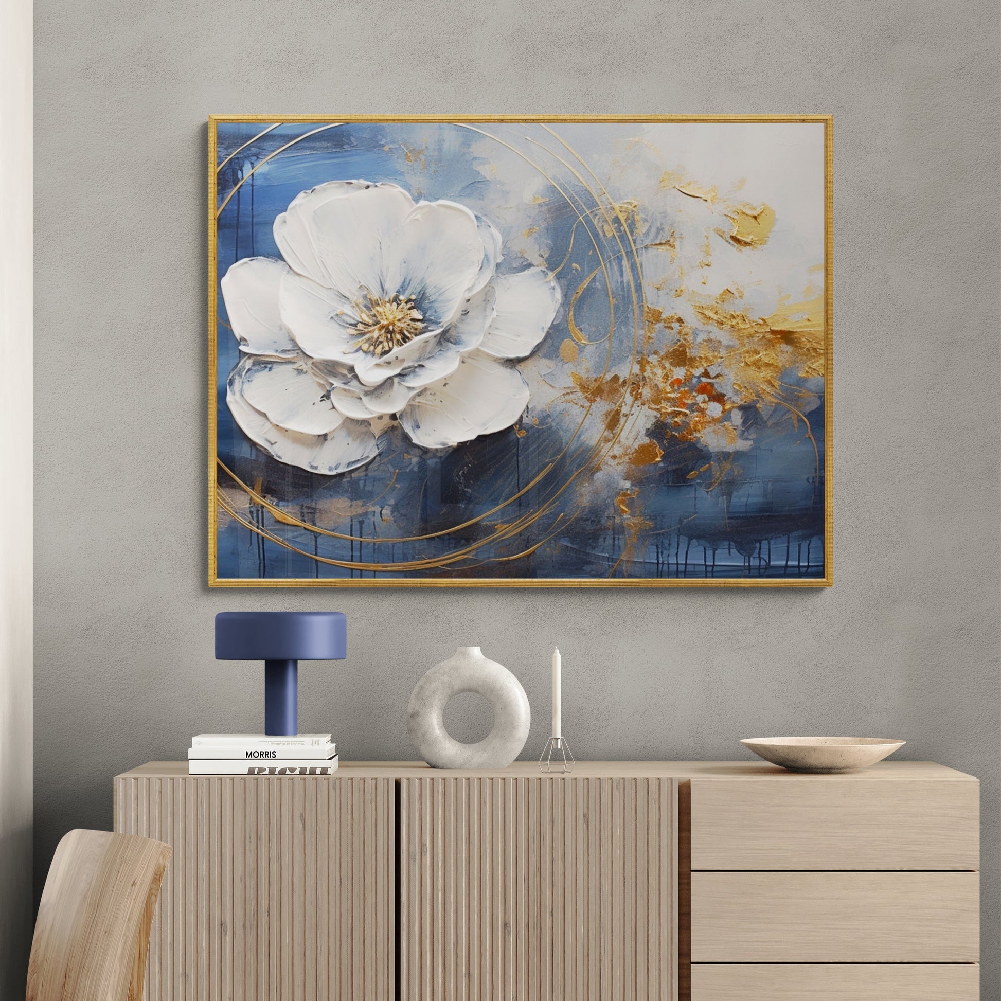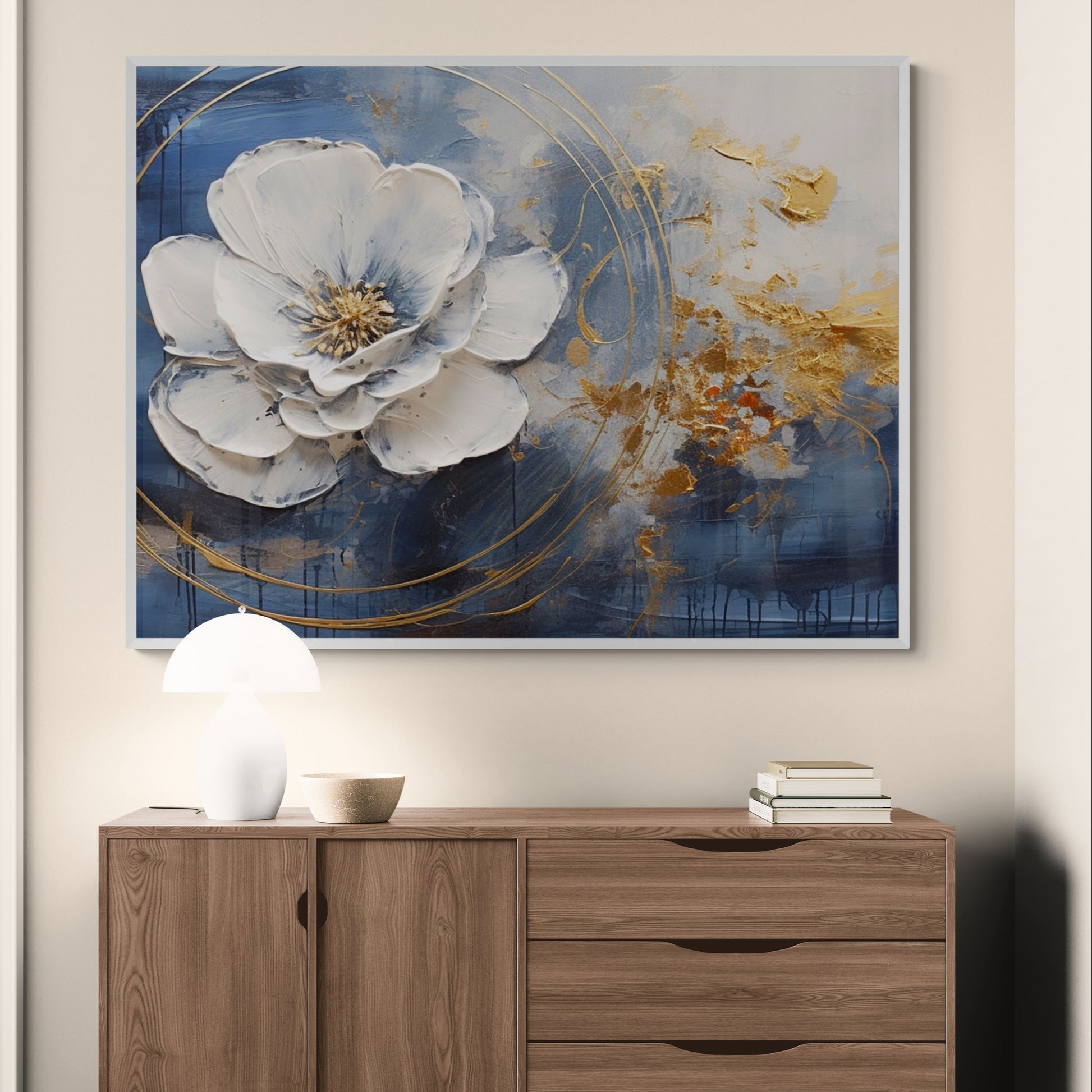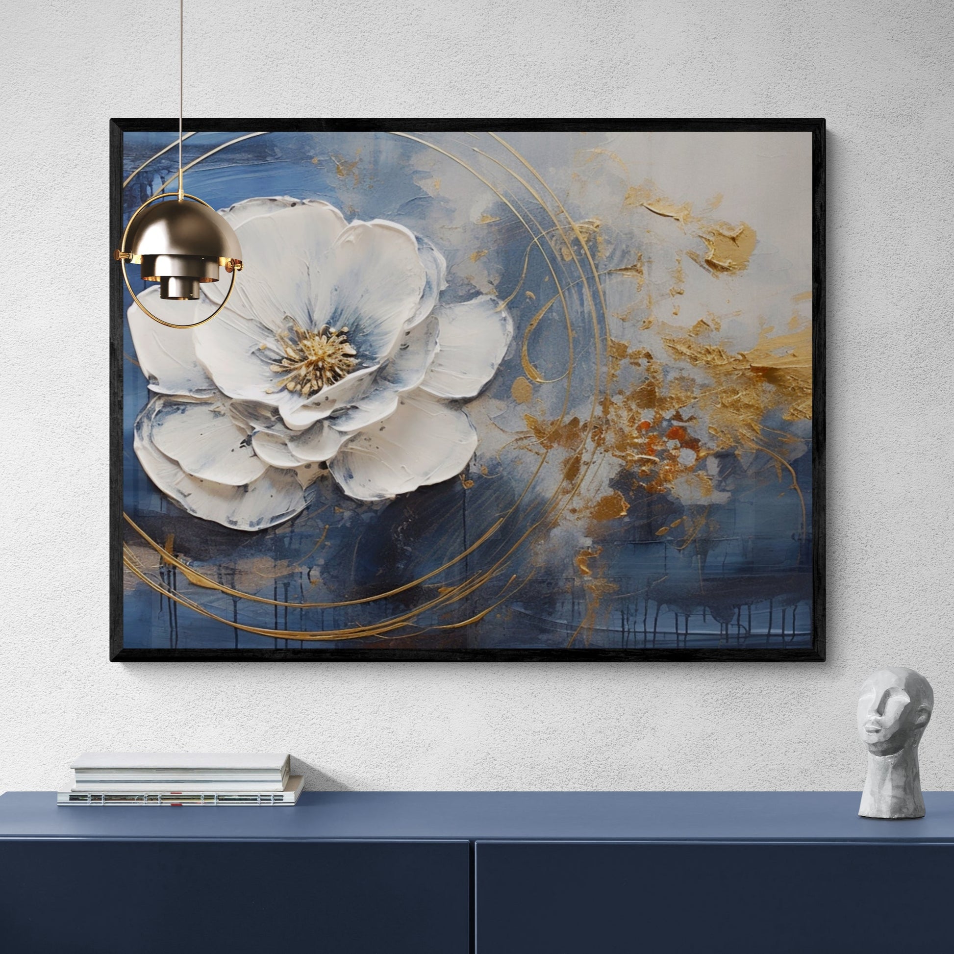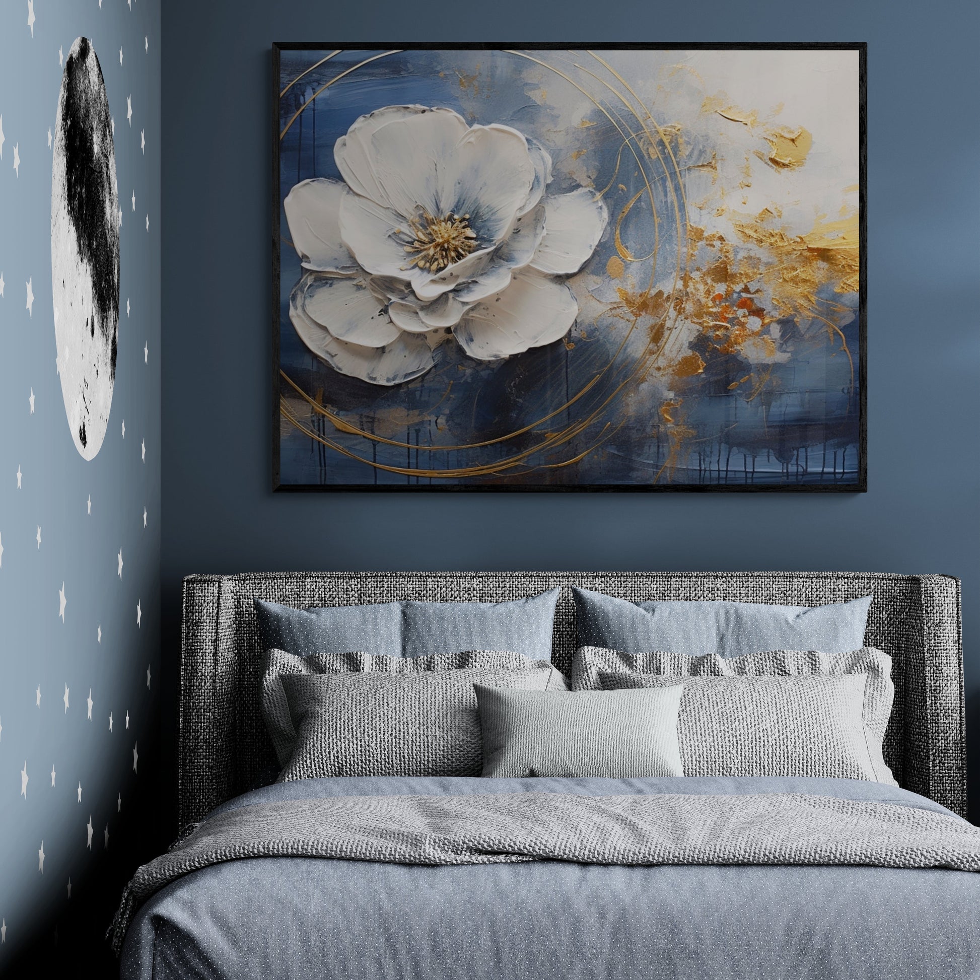 Plongez dans l’élégance de la collection florale avec ce tableau majestueux mêlant des nuances profondes de bleu nuit, des éclats dorés raffinés et une fleur blanche texturée aux détails saisissants. Ce contraste subtil entre la douceur de la pétale et la richesse des effets métallisés crée une atmosphère à la fois apaisante et luxueuse.