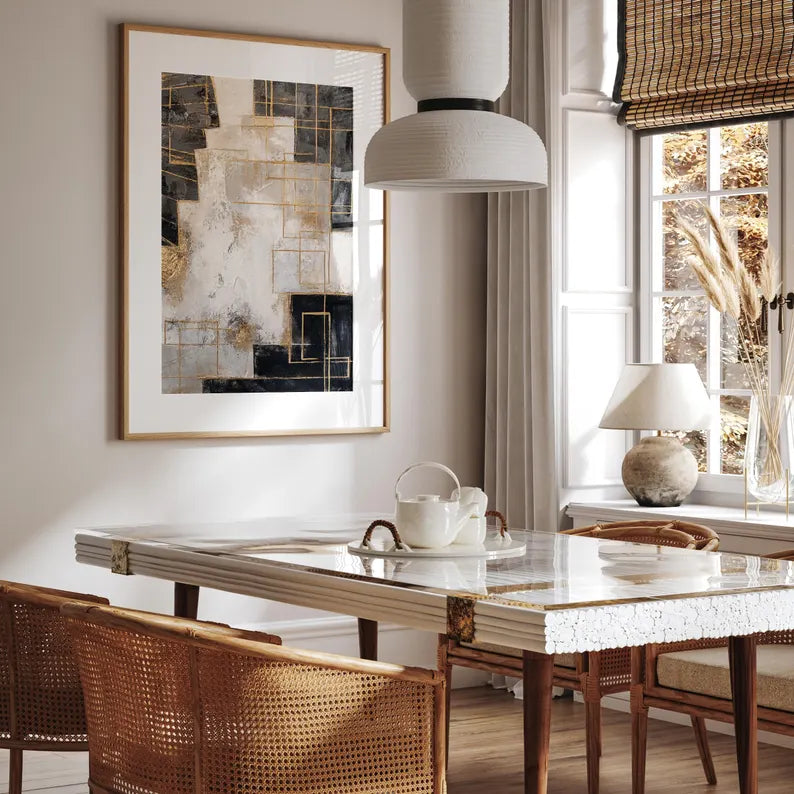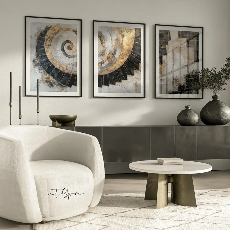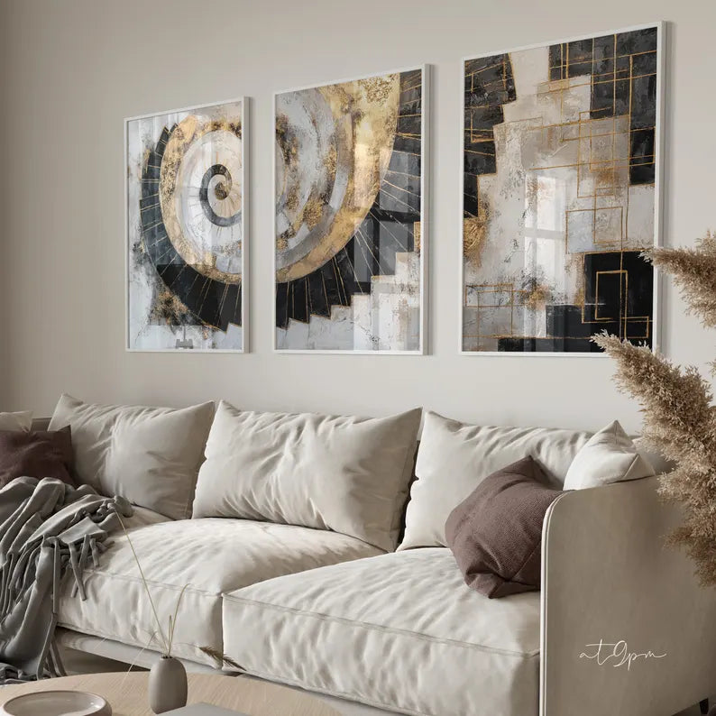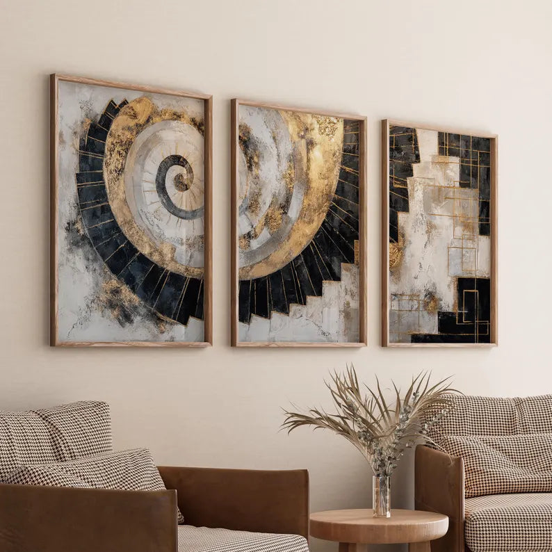 Parfait pour habiller un salon, un bureau ou une salle à manger, ce triptyque allie élégance contemporaine et sophistication intemporelle. Les couleurs noir, blanc, gris et or se marient facilement avec tous les styles de décoration, du moderne au minimaliste.