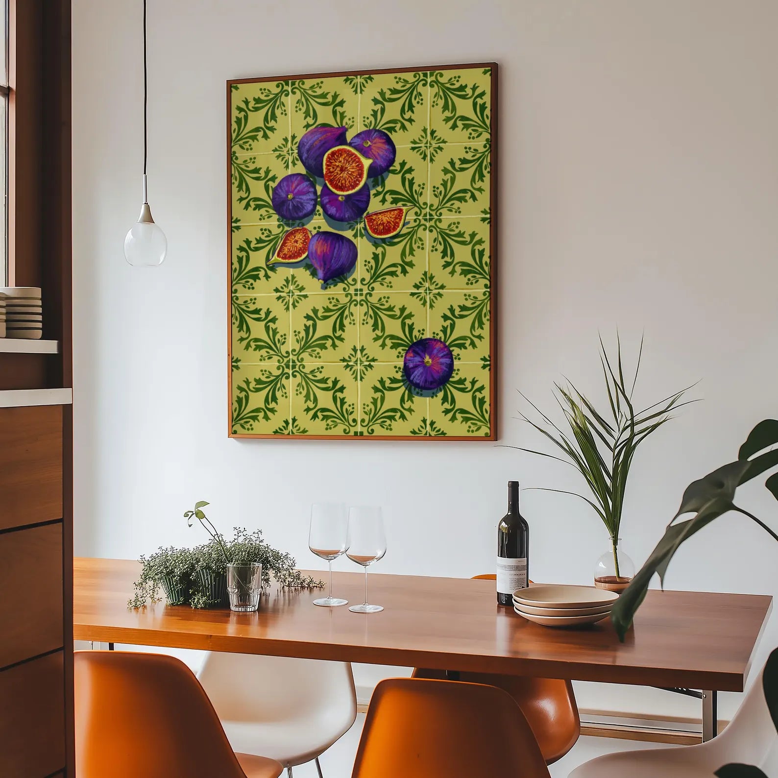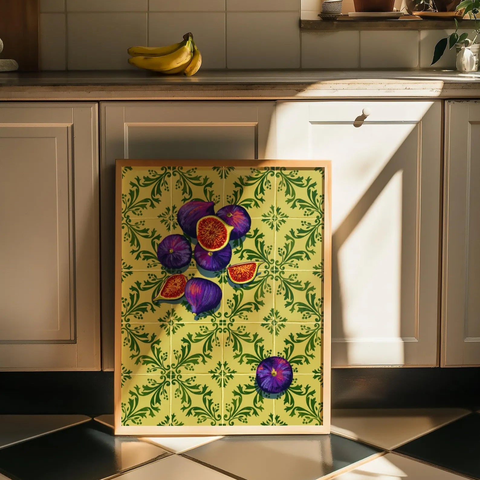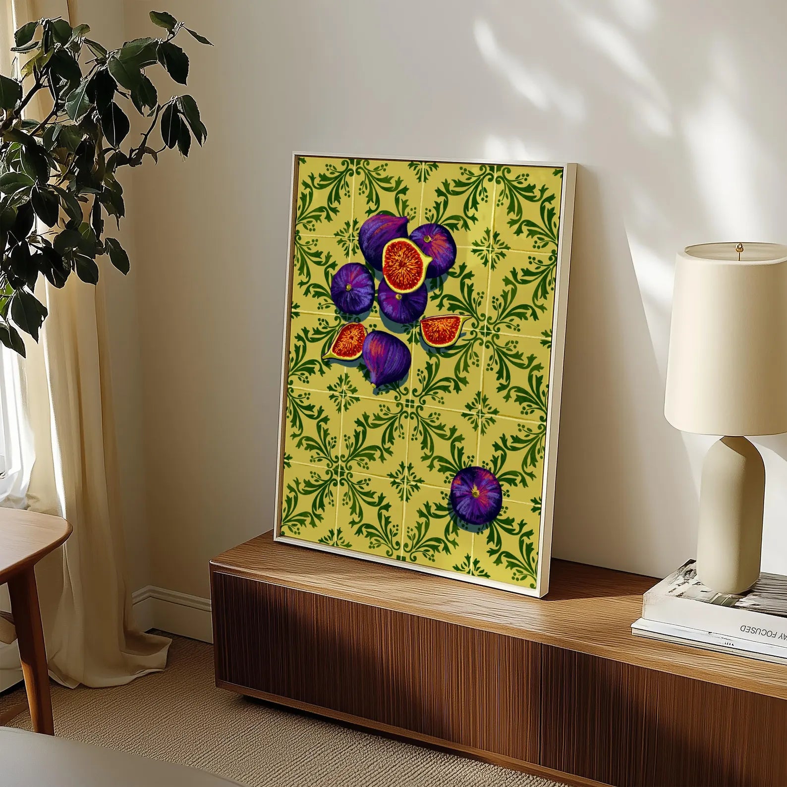 Sublimez vos murs avec cette illustration vibrante de figues juteuses déposées sur un fond jaune à motifs floraux verts inspirés des zelliges marocains. La richesse des tons violets et orangés contraste harmonieusement avec l’arrière-plan ensoleillé, créant une œuvre aussi gourmande que décorative.
