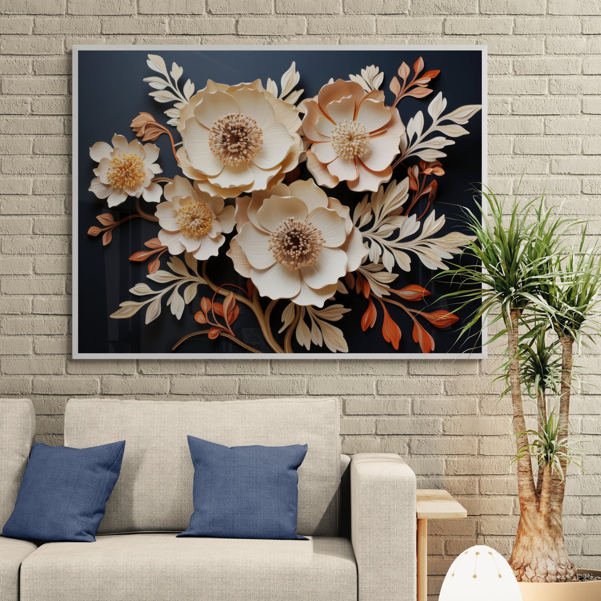 Ajoutez une touche de noblesse et d'élégance à votre décoration avec "Fleur de Prestige", un tableau à l’effet sculpté en relief qui sublime l’art floral. Les pétales crème et les feuillages dorés et cuivrés ressortent magnifiquement sur le fond sombre, créant une composition riche, profonde et moderne à la fois.