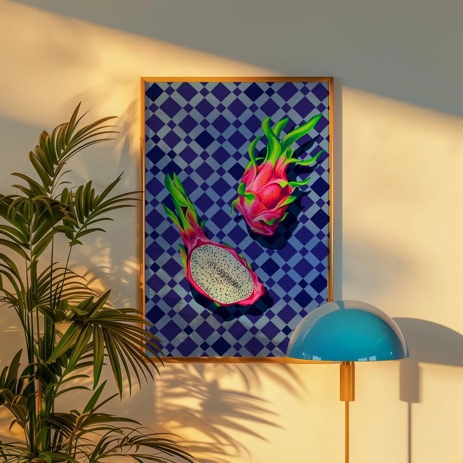 Osez la fraîcheur tropicale avec cette illustration vibrante mettant en vedette un fruit du dragon éclatant, délicatement posé sur un motif géométrique bleu. Ce contraste audacieux entre les couleurs vives du fruit rose fuchsia et le carrelage froid crée une œuvre moderne et dynamique qui attire instantanément le regard.
