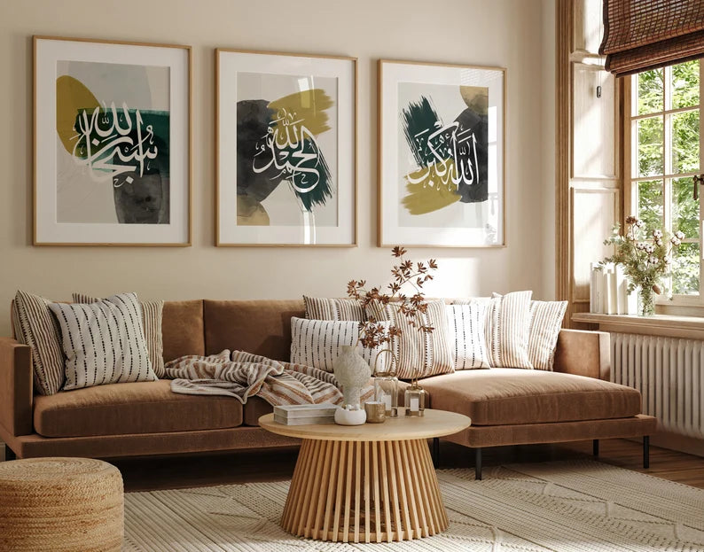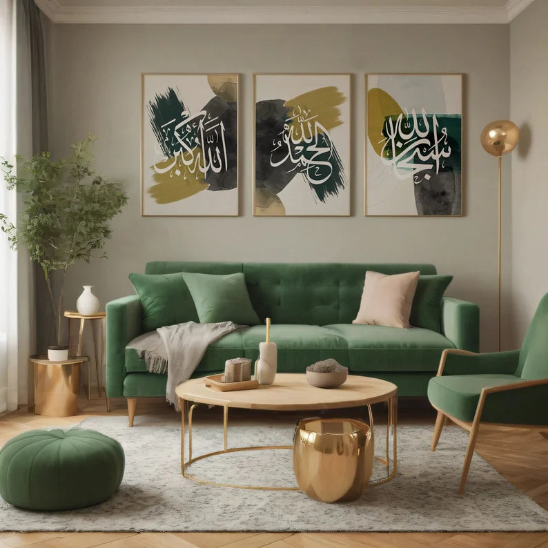 Sublimez votre intérieur avec ce magnifique triptyque de calligraphie islamique, alliant élégance contemporaine et spiritualité intemporelle. Chaque tableau met en valeur une calligraphie arabe sacrée sur un fond abstrait aux nuances harmonieuses de vert, noir et or, apportant chaleur et sérénité à votre espace.
