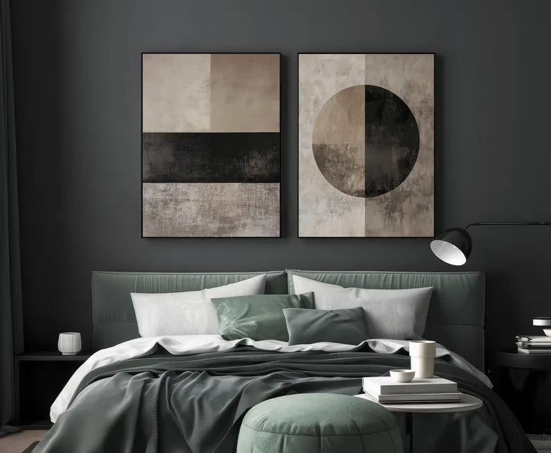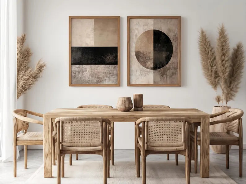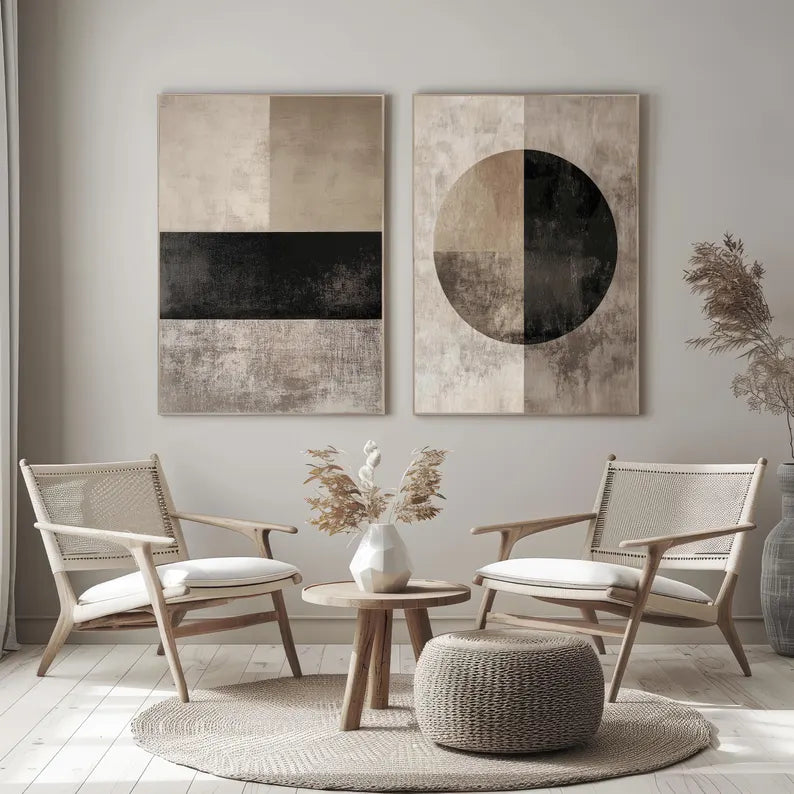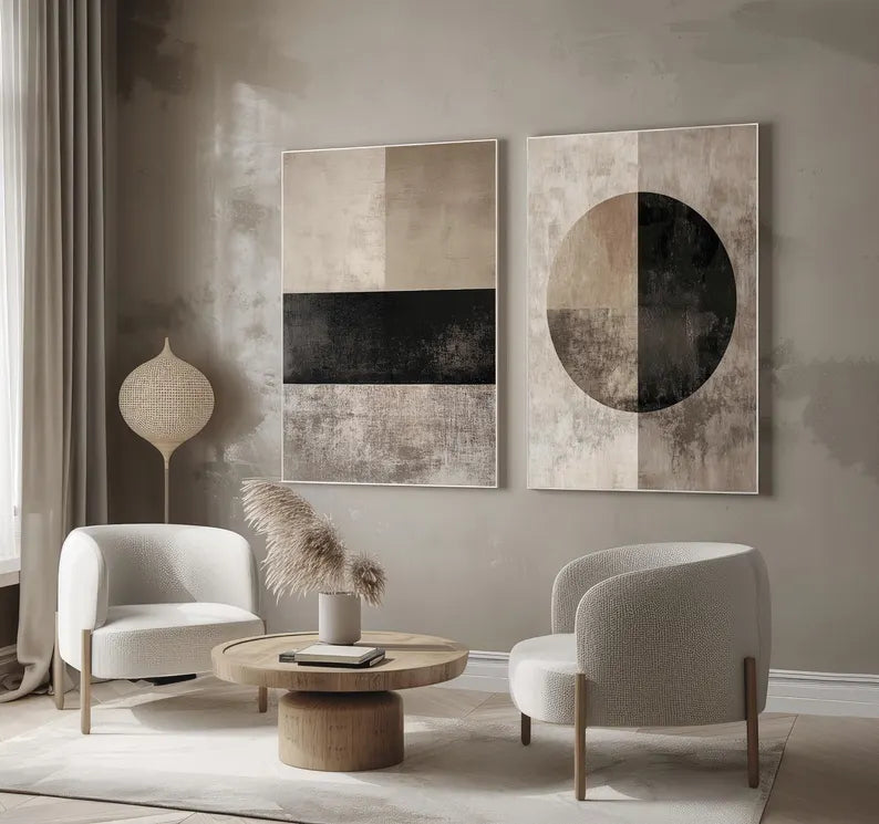 Grâce à leur palette de couleurs neutres et chaleureuses, ces œuvres s’intègrent facilement dans différents styles de décoration — qu’il s’agisse d’un intérieur scandinave, contemporain, bohème chic ou minimaliste. Placés côte à côte au-dessus d’un canapé, dans une salle à manger ou un bureau, ils deviennent une pièce maîtresse qui attire le regard tout en conservant une atmosphère douce et apaisante.