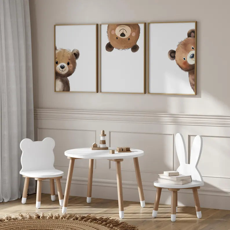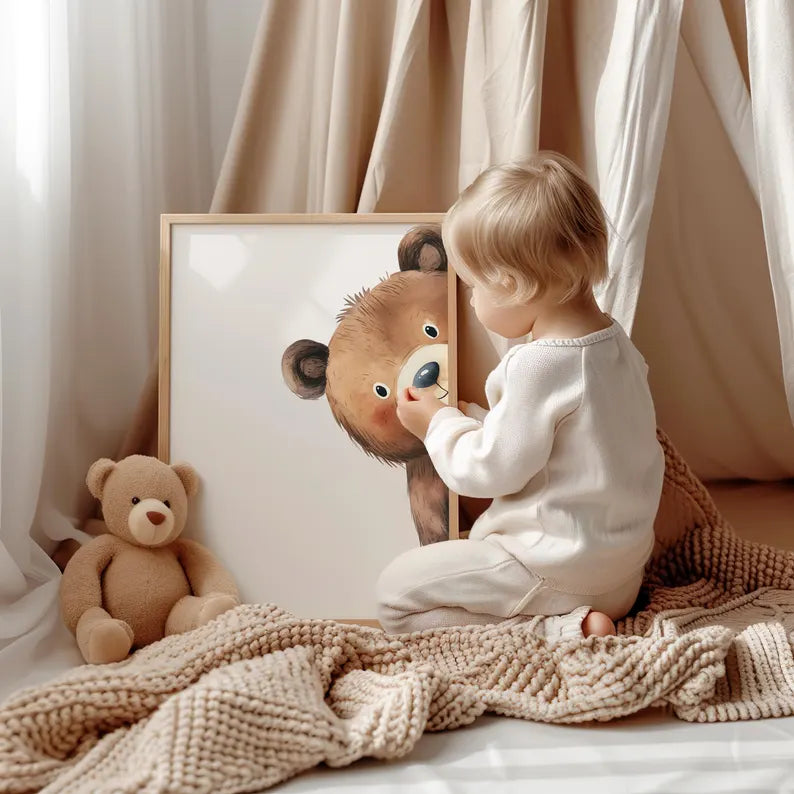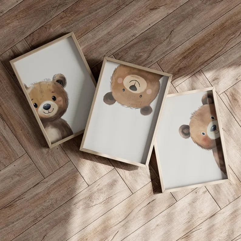 Offrez à la chambre de votre enfant un univers tendre et joyeux avec notre collection Les Oursons Curieux, un ensemble unique de trois tableaux ludiques qui captivent l’œil et réchauffent le cœur. Chaque tableau met en scène un adorable ourson qui se dévoile d’un angle différent : l’un observe timidement, l’autre se balance la tête à l’envers, et le dernier se cache à moitié comme pour jouer à cache-cache.