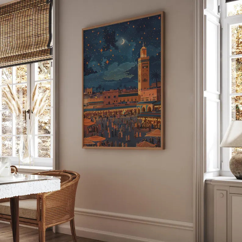 Les détails soignés de cette œuvre capturent l’essence d’un soir marocain : les marchands, les passants, les odeurs d’épices, les sons des musiciens de rue... Le tout enveloppé d’un ciel bleu profond constellé d’étoiles scintillantes et d’un croissant de lune qui surplombe la scène avec poésie.