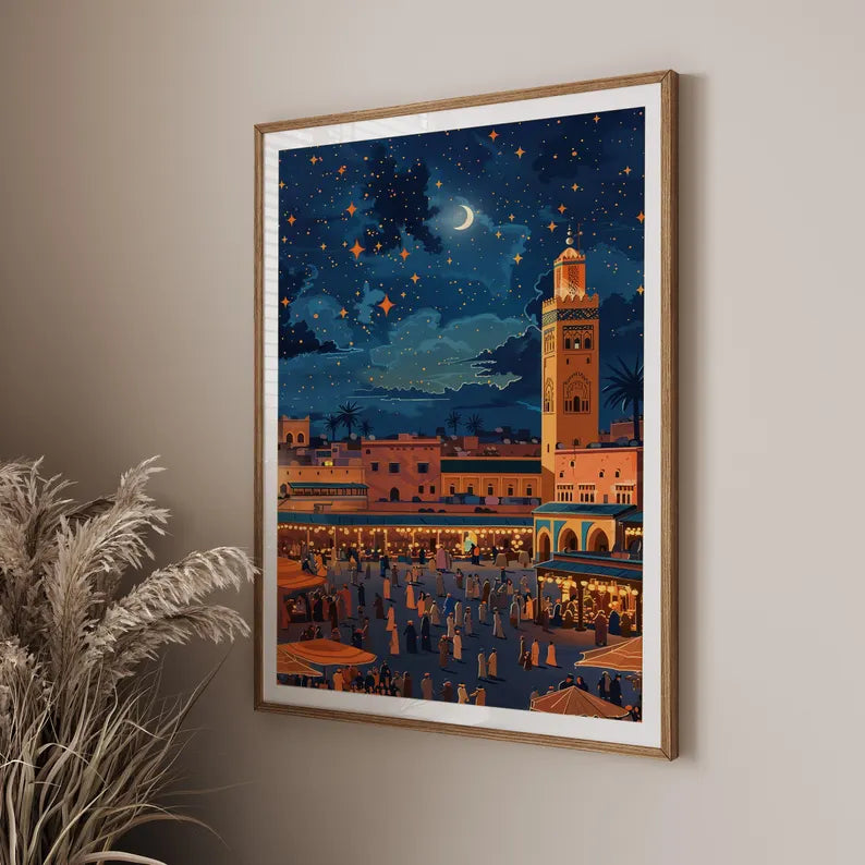 Plongez dans la magie nocturne de Marrakech avec cette illustration captivante représentant la mythique place Jemaa el-Fna sous un ciel étoilé. À la lumière des lanternes et des échoppes animées, la médina prend vie dans une ambiance chaleureuse et envoûtante, dominée par le minaret emblématique de la Koutoubia.