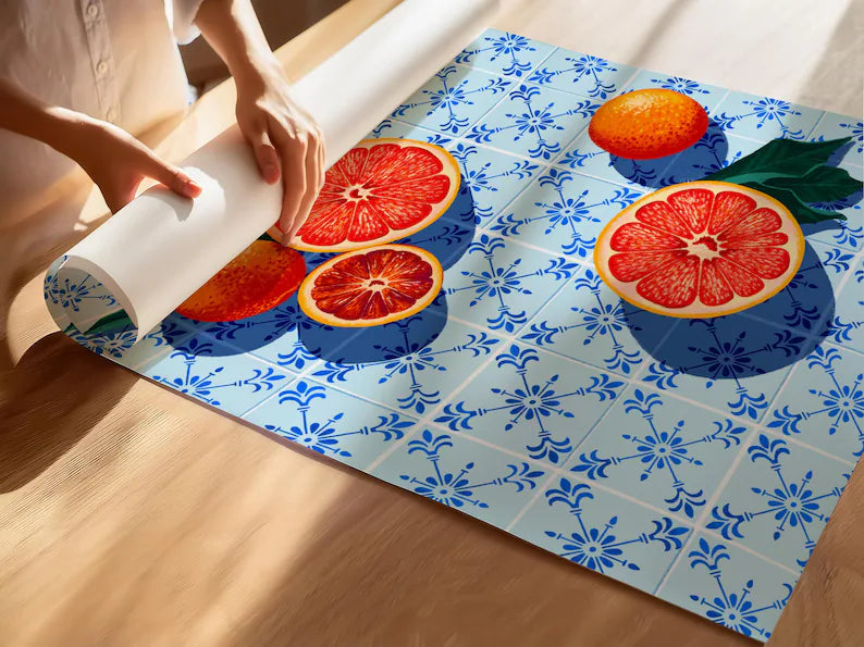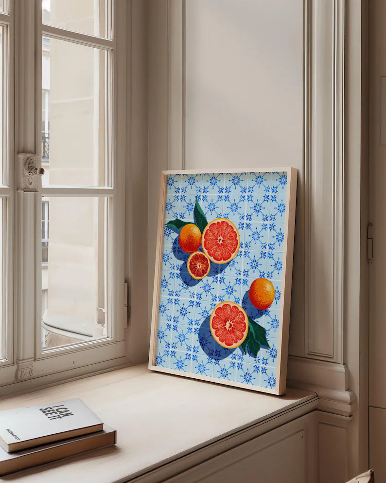 Apportez une touche de fraîcheur et de soleil à votre intérieur avec cette magnifique illustration d’oranges juteuses et éclatantes, posées sur un fond de carreaux traditionnels bleu azur. Cette œuvre mêle l’authenticité du design méditerranéen à une composition fruitée vibrante, idéale pour illuminer une cuisine, une salle à manger ou un coin lecture avec charme et vitalité.