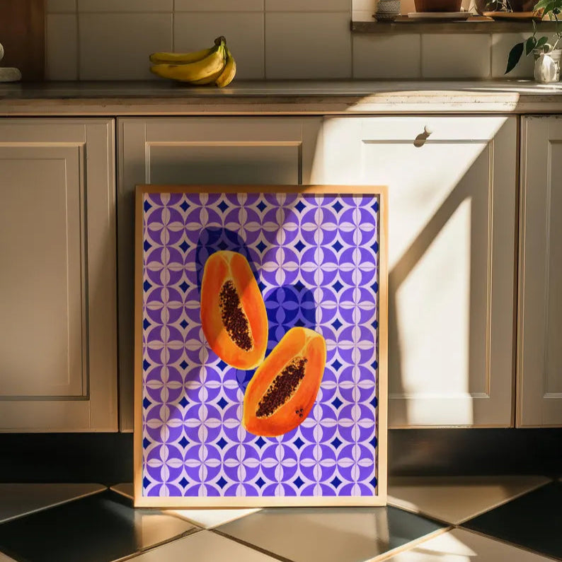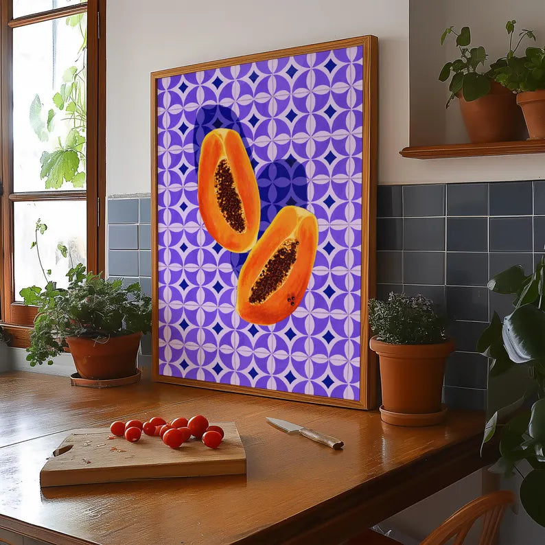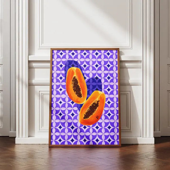 Apportez une touche de chaleur et de vitalité à votre intérieur avec cette affiche illustrant deux moitiés de papaye sur un fond géométrique violet rétro. L’association des tons orange vif du fruit et du motif à cercles concentriques crée une ambiance à la fois nostalgique et moderne, idéale pour dynamiser une cuisine ou un coin repas.