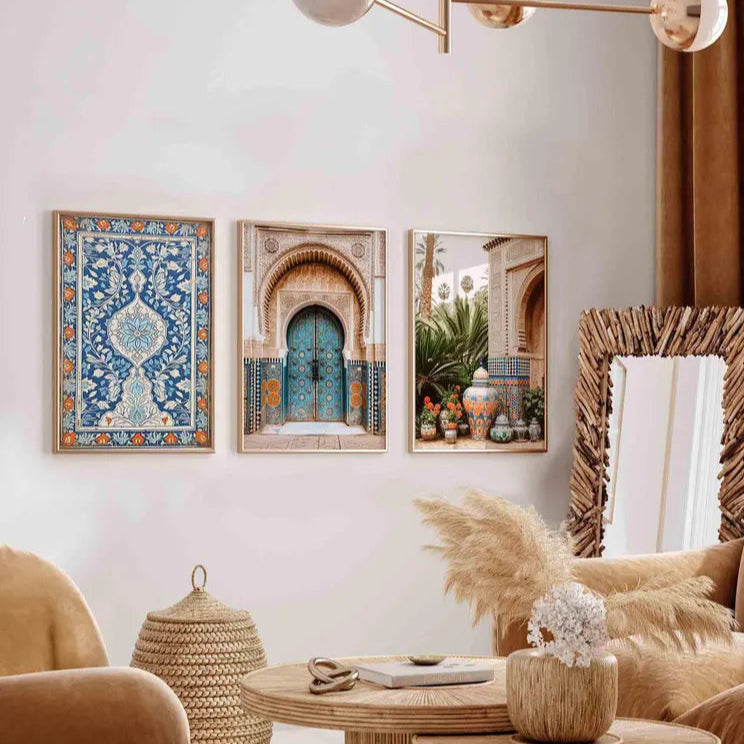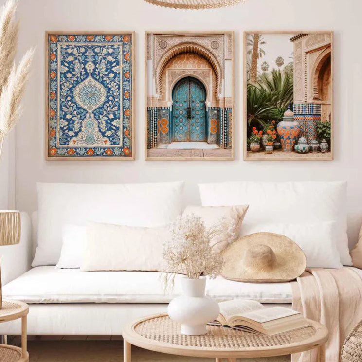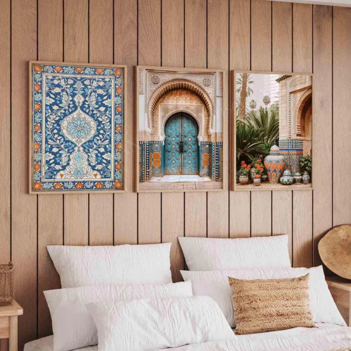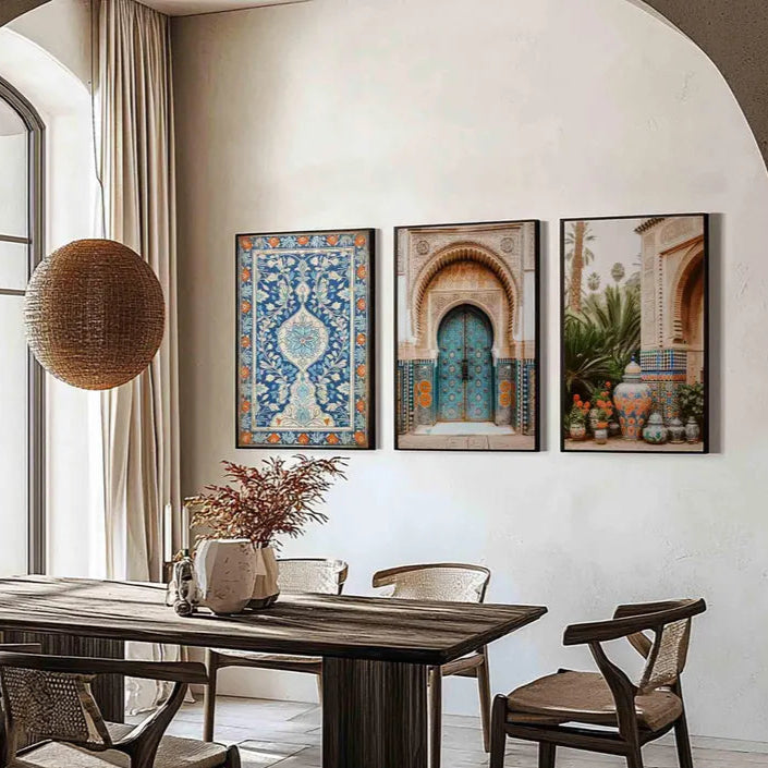 Transformez votre intérieur en un véritable écrin d’évasion grâce à cette collection murale inspirée du patrimoine marocain. Chaque tableau met en valeur des éléments emblématiques de l’architecture et de l’art décoratif du Maroc : portes majestueuses sculptées, mosaïques traditionnelles (zelliges), céramiques artisanales et décors floraux luxuriants.
