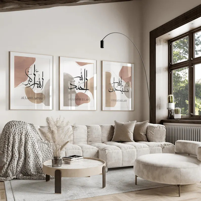 Apportez une touche de spiritualité et d’élégance à votre intérieur avec cet ensemble de 3 tableaux islamiques modernes. Chaque pièce met en valeur une calligraphie arabe raffinée : Allahu Akbar, Al Hamdulillah et SubhanAllah, inscrites sur un fond abstrait aux tons neutres beige, marron et blanc. Ce style minimaliste s’adapte parfaitement à tout type de décoration, qu’elle soit contemporaine ou traditionnelle.