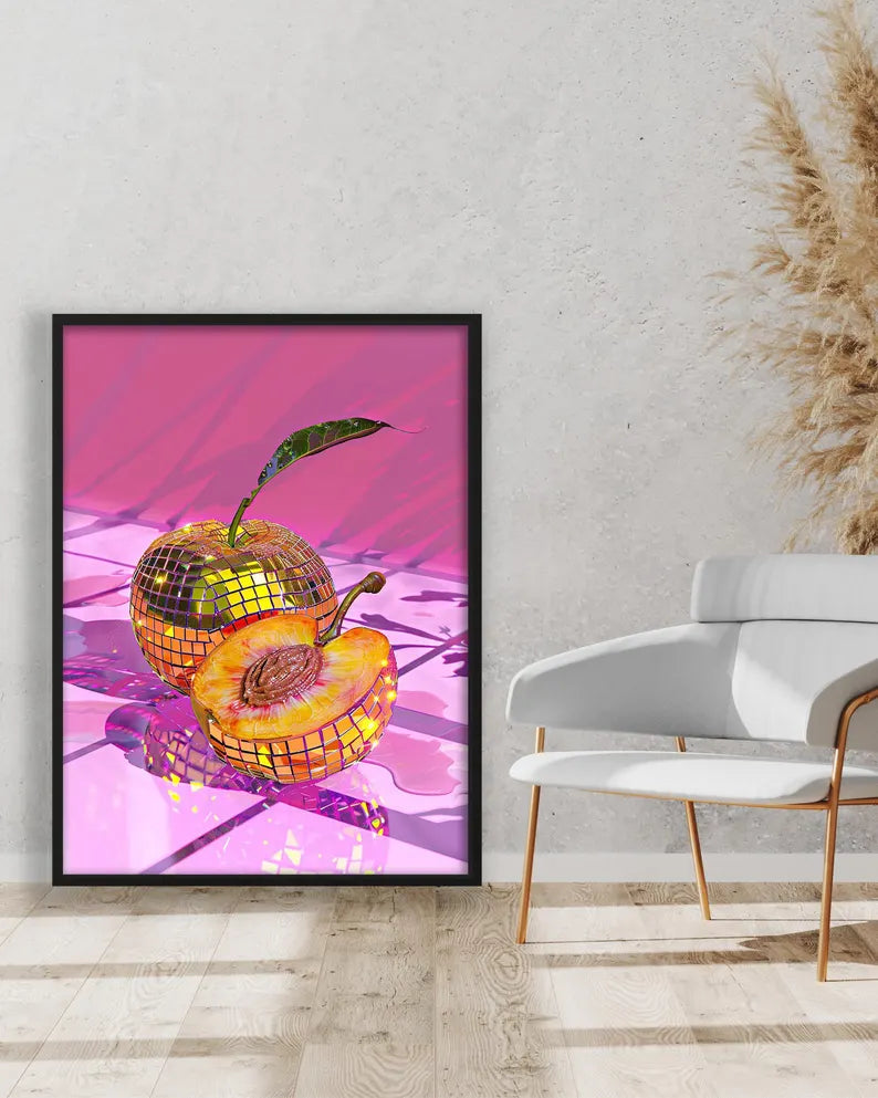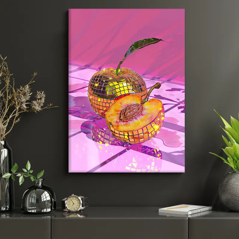 Transformez votre espace en un véritable terrain de jeu visuel avec ce tableau surprenant et captivant. Cette création met en scène deux prunes réinventées sous forme de boules à facettes scintillantes, comme tout droit sorties d’une piste de danse disco. Les reflets dorés et argentés épousent à merveille les nuances chaudes et juteuses du fruit, créant un contraste à la fois gourmand et festif.