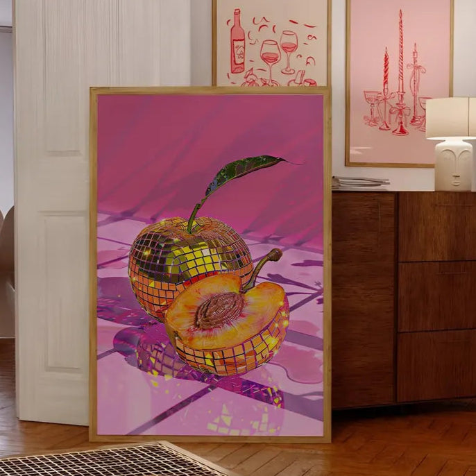 Le fond rose intense, parcouru de jeux d’ombres et de lumières, amplifie l’énergie et le dynamisme de la composition. Chaque éclat de lumière se reflète sur la surface miroitante des fruits, donnant l’impression qu’ils vibrent au rythme d’une soirée endiablée. Cette œuvre marie subtilement humour visuel, esthétique pop art et audace contemporaine, pour un rendu qui attire immanquablement le regard.