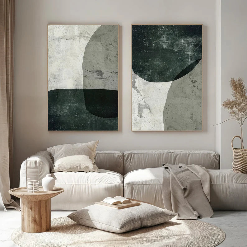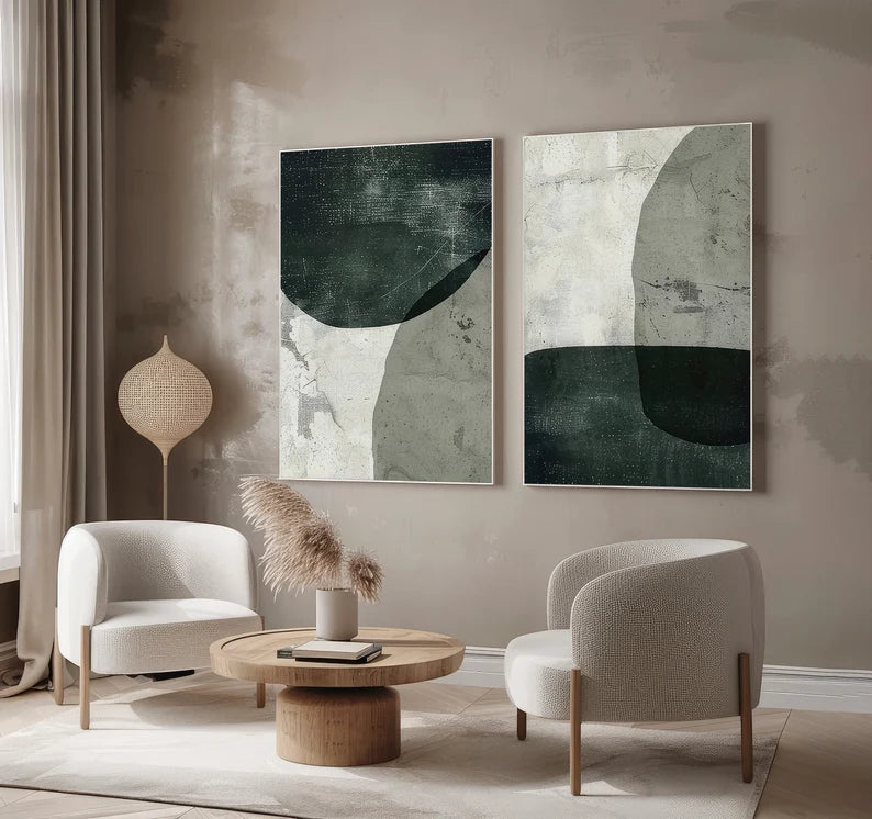 Plongez dans une atmosphère apaisante avec ce diptyque abstrait vert et gris, où formes organiques et textures subtiles s’entrelacent pour créer un équilibre visuel parfait. Les deux toiles jouent avec des contrastes doux : des zones d’un vert profond, presque forestier, se fondent dans des dégradés gris clair, rappelant la pierre et la lumière diffuse.