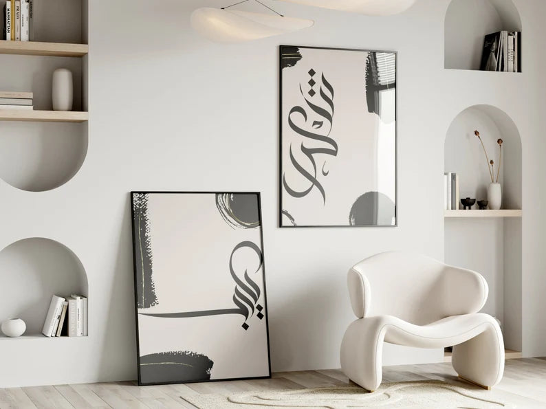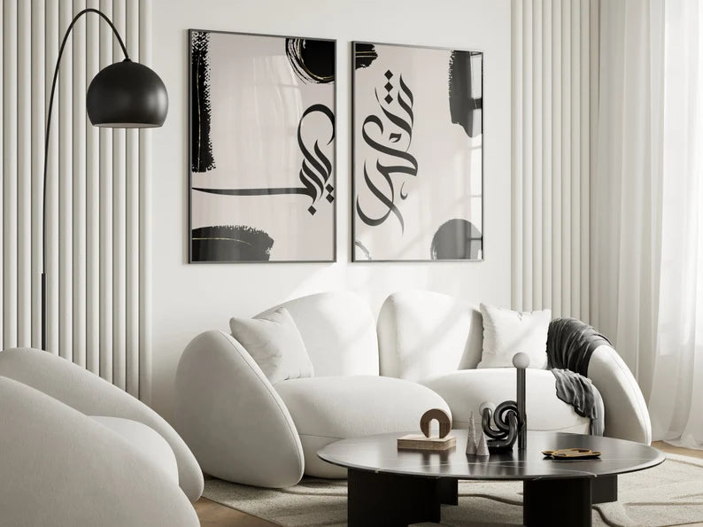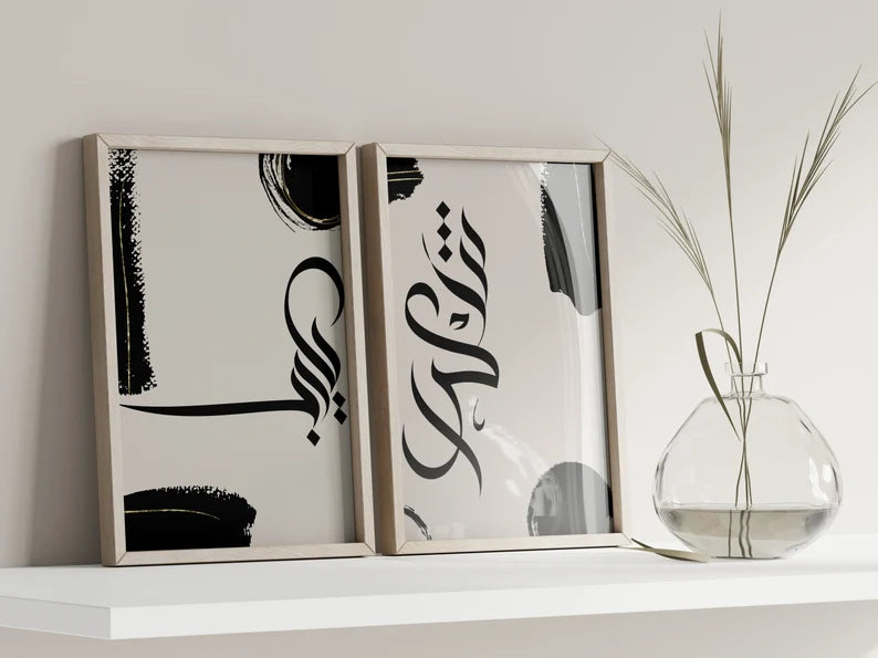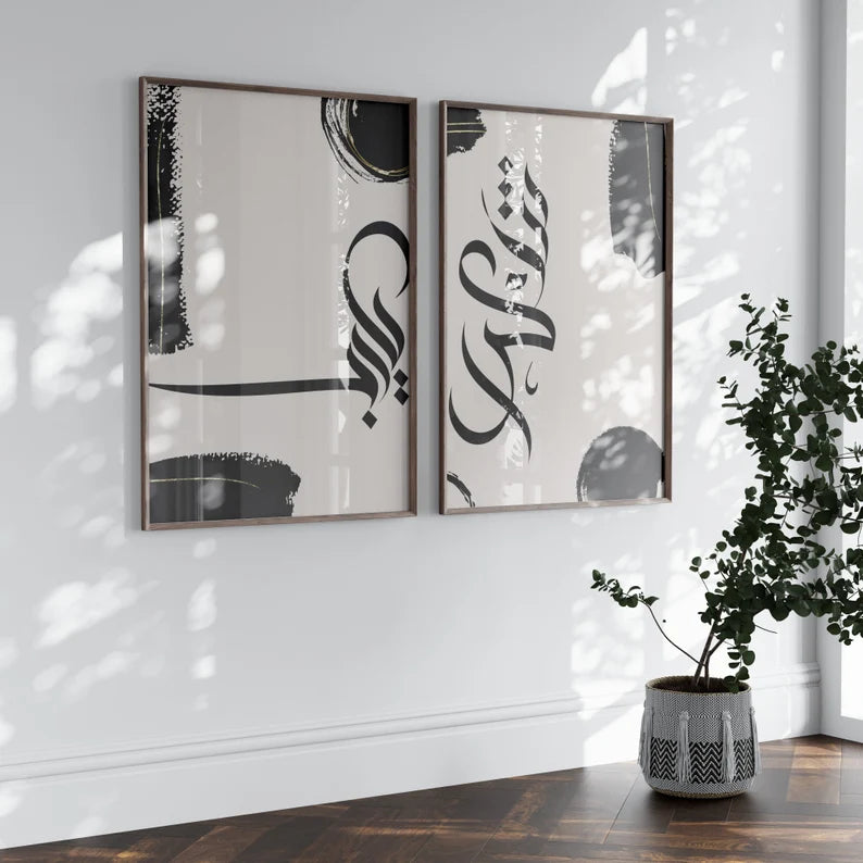 Apportez une touche d’élégance et de spiritualité à votre intérieur avec ce duo de tableaux islamiques en calligraphie arabe moderne. Les traits noirs fluides et les touches discrètes d’or se détachent harmonieusement sur un fond beige doux, créant une composition à la fois contemporaine et intemporelle. Parfait pour orner un salon, une chambre ou un espace de prière, ce design minimaliste s’intègre facilement à différents styles de décoration. Disponible en tailles 40×50 cm et 60×80 cm avec livraison gratuite, ce tableau est une invitation à allier foi et esthétique dans votre espace de vie.