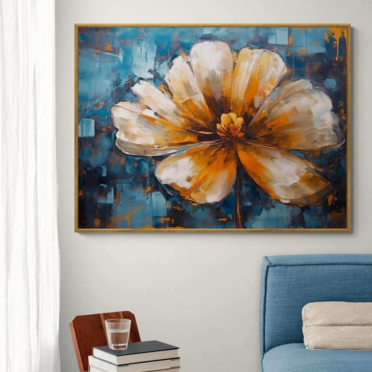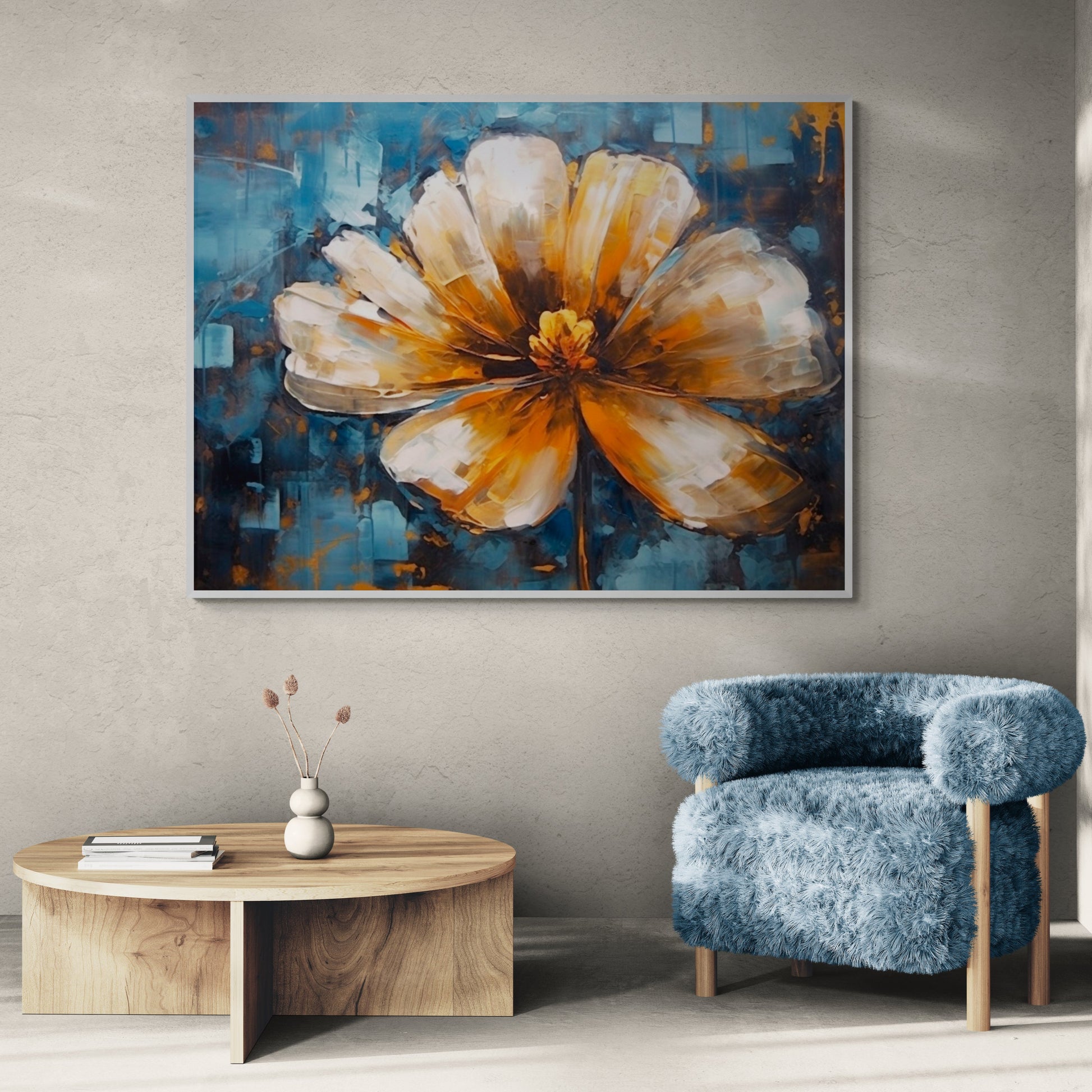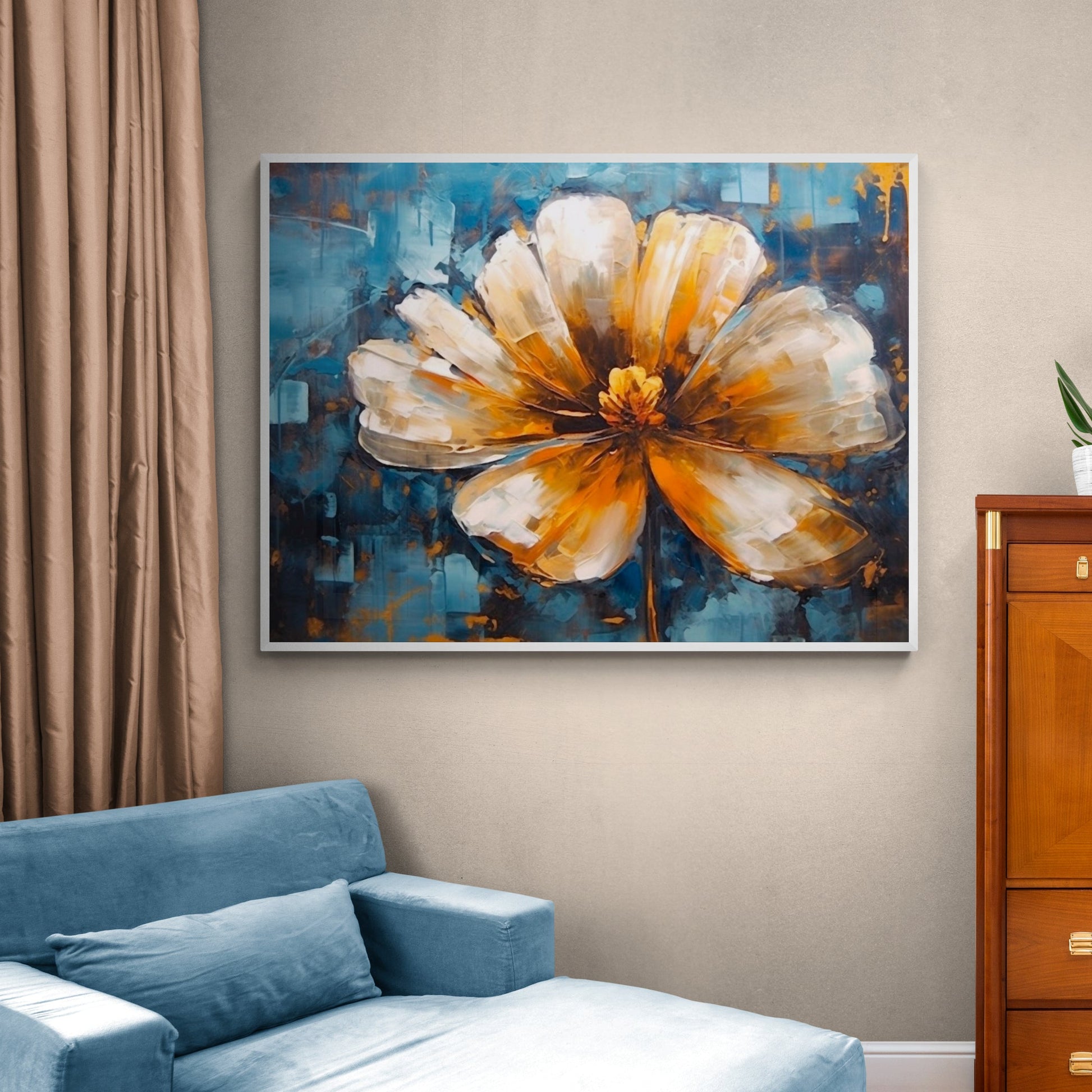 Laissez entrer la lumière dans votre intérieur avec "Soleil Intérieur", un tableau qui marie à la perfection le bleu profond d’un ciel abstrait et l’éclat chaleureux d’une fleur aux pétales dorés et lumineux. Chaque coup de pinceau donne vie à une texture vivante et une énergie solaire qui dynamise instantanément n’importe quelle pièce.
