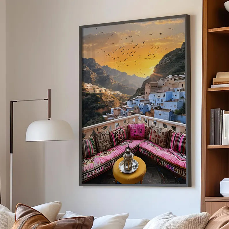 Laissez-vous transporter dans une ambiance typiquement marocaine avec ce tableau inspirant qui capture la magie d’un coucher de soleil sur un village berbère perché entre les montagnes.