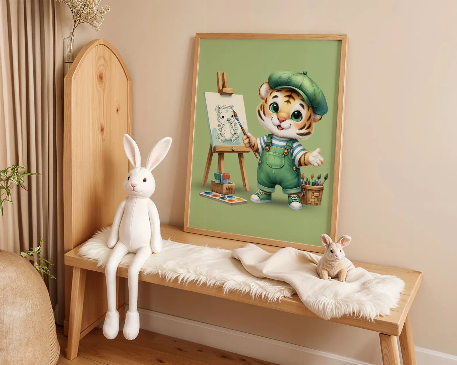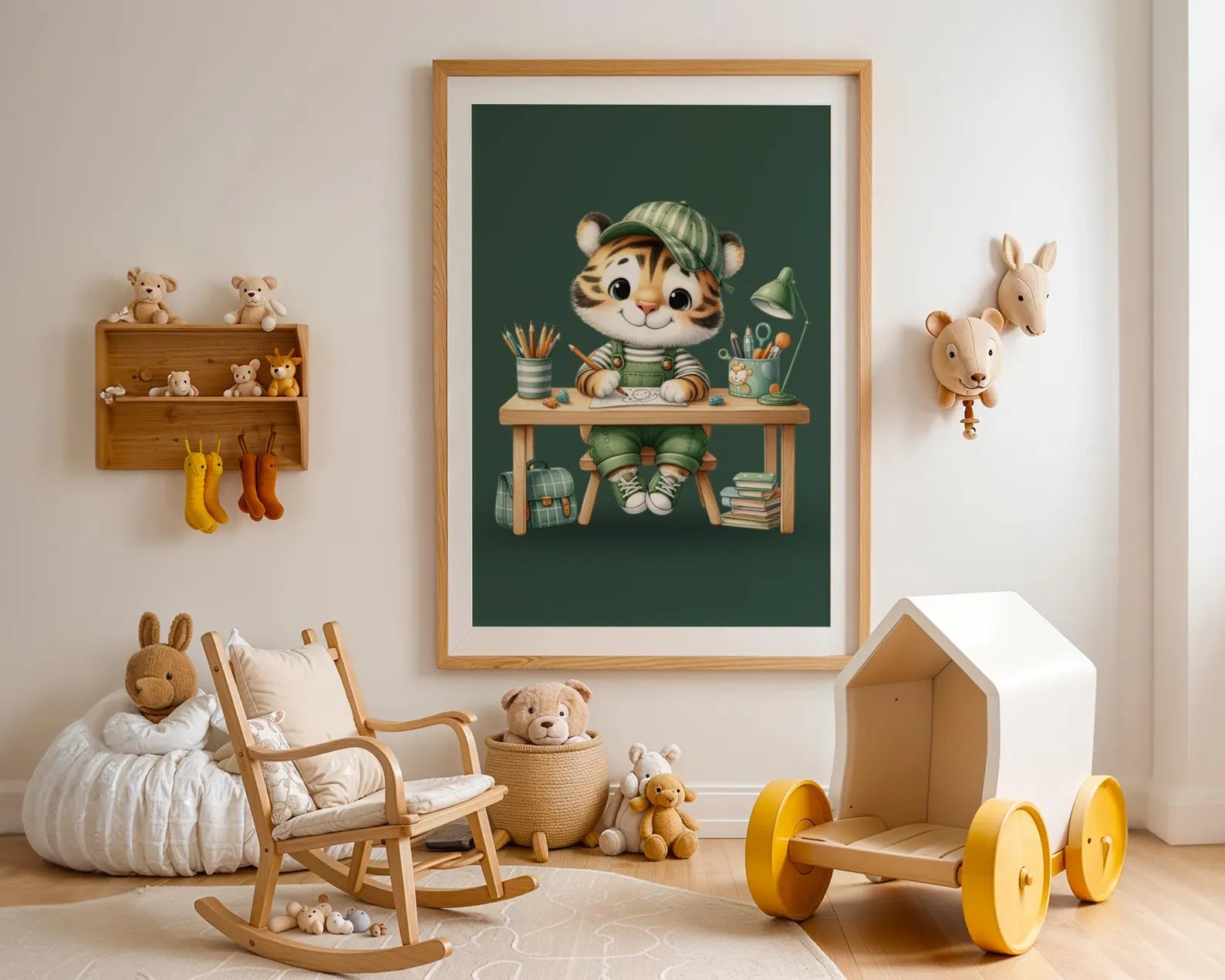 Offrez à la chambre de votre enfant une décoration pleine de créativité et de douceur avec cet adorable trio de tableaux représentant un petit tigre artiste. Chaque illustration met en scène ce personnage attendrissant dans différentes activités : en train de peindre, se détendre sous un arbre et dessiner à son bureau.
