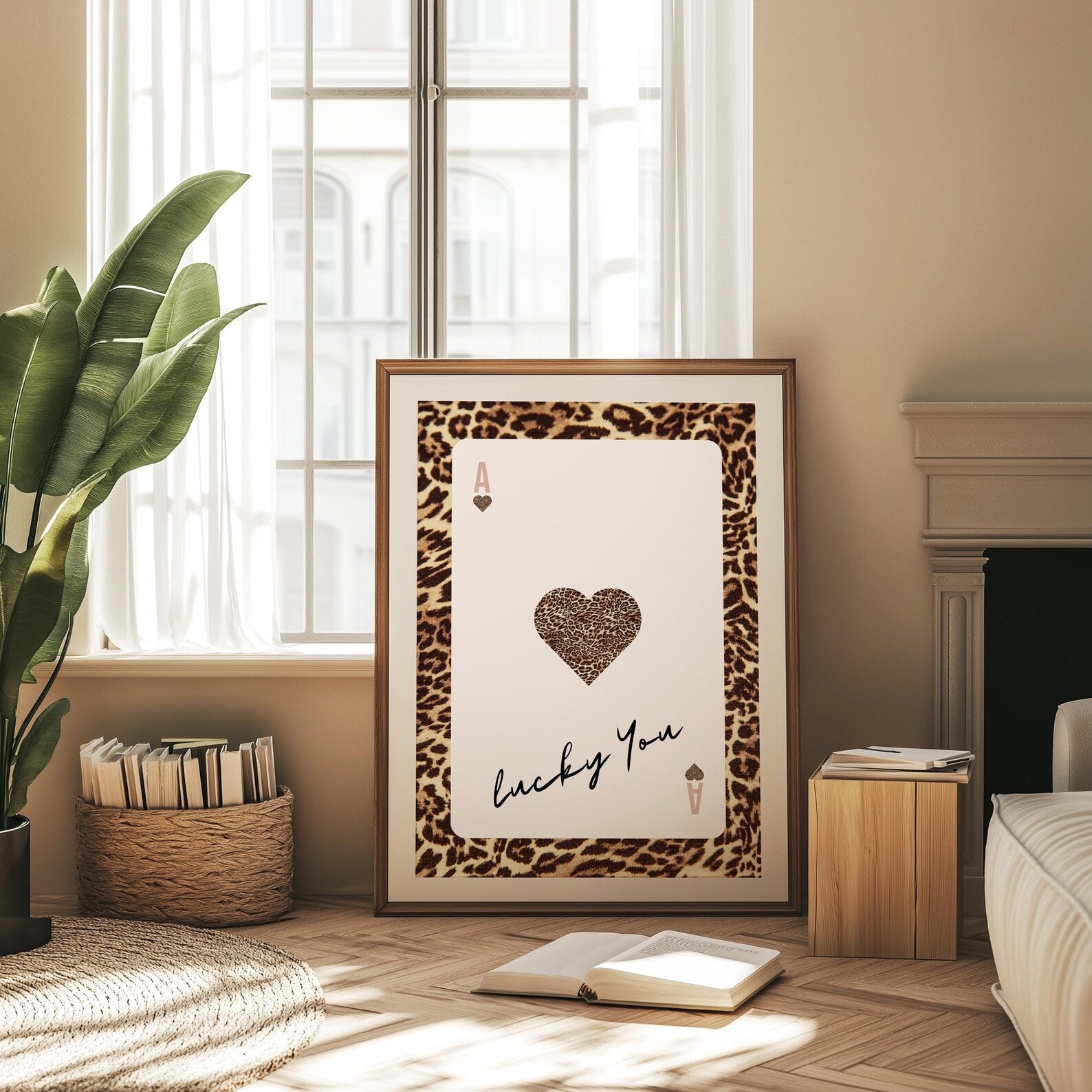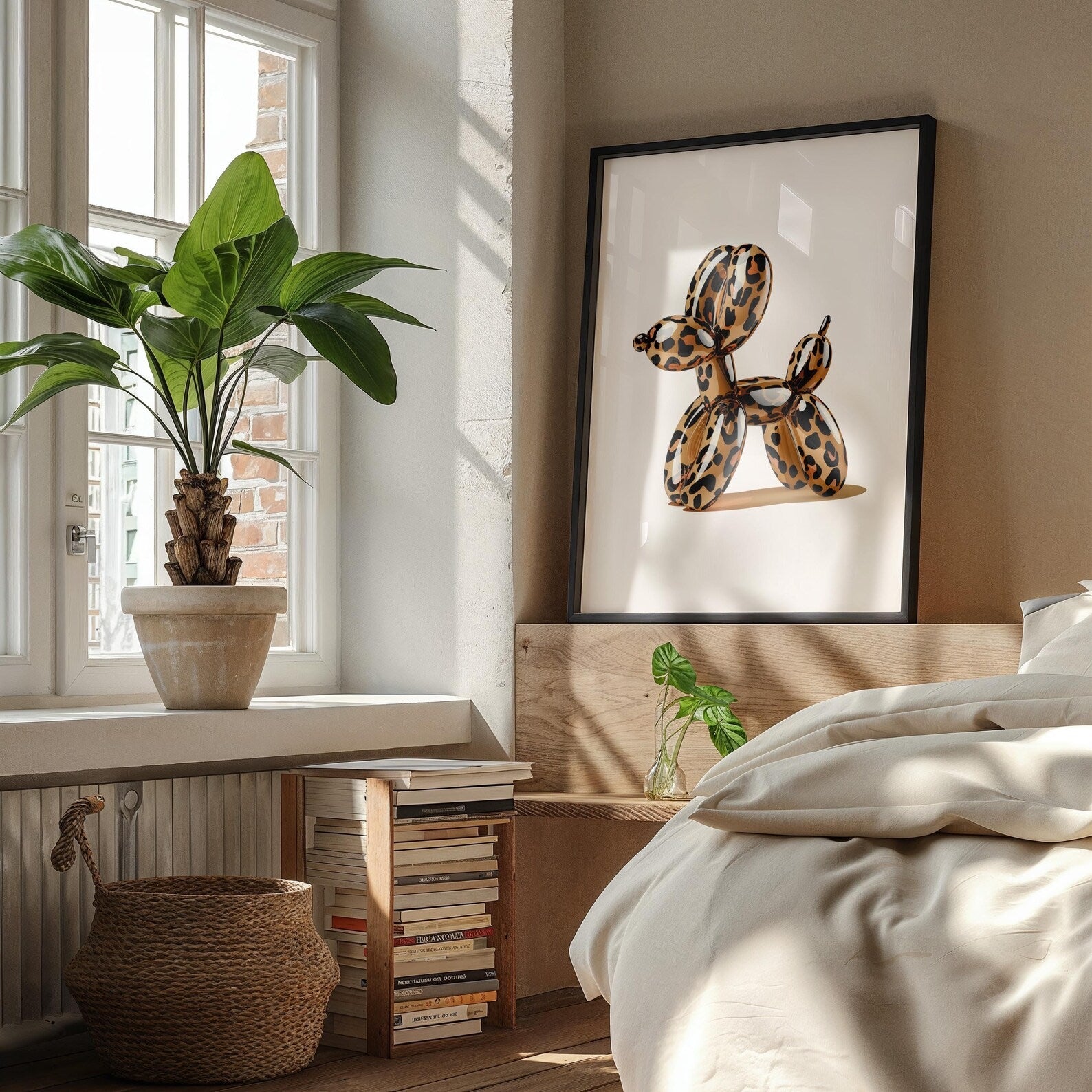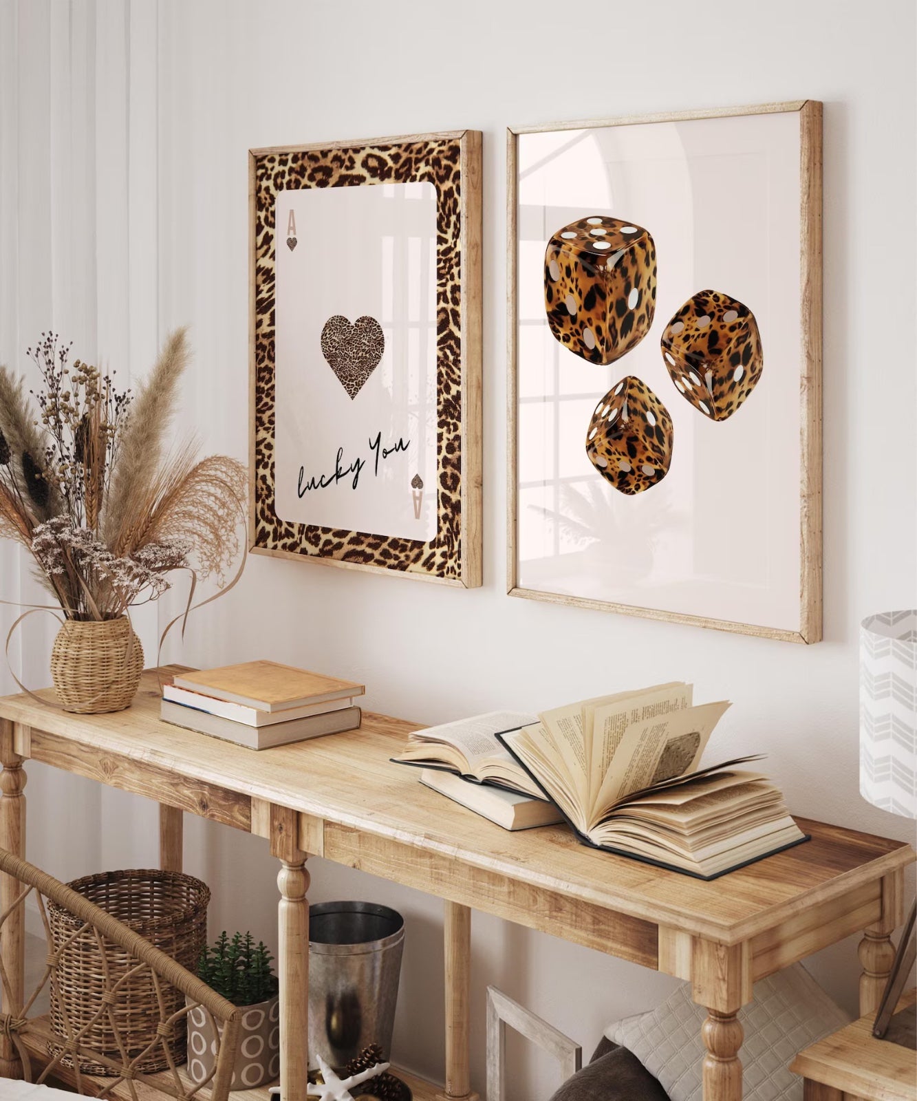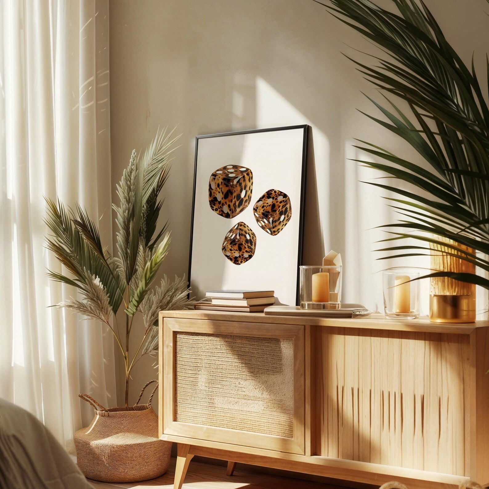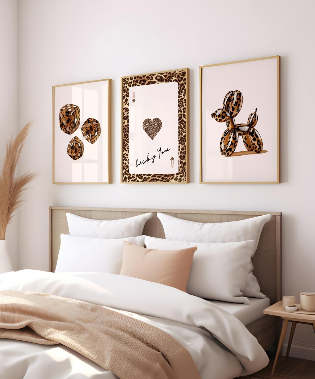 Apportez du caractère et du style à votre intérieur avec Léopard Chic, un trio d'affiches artistiques au motif léopard. Ce design unique met en scène des icônes modernes – dés, carte de jeu et chien ballon – dans une version glamour et sauvage. Parfait pour les amateurs de décoration originale et tendance.