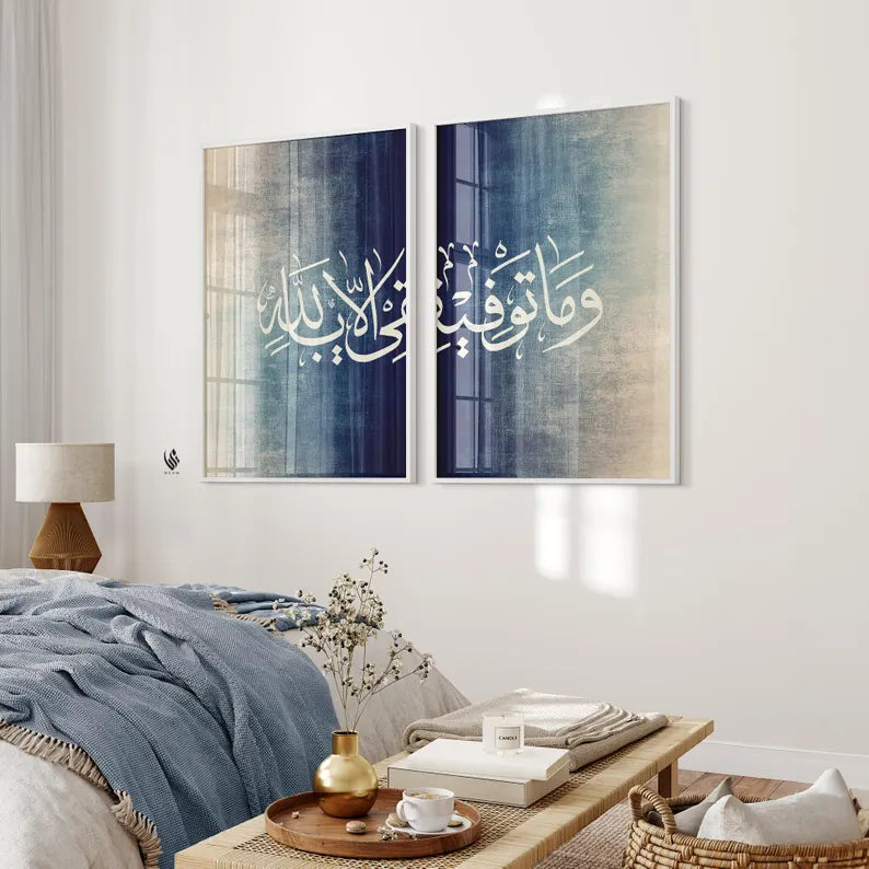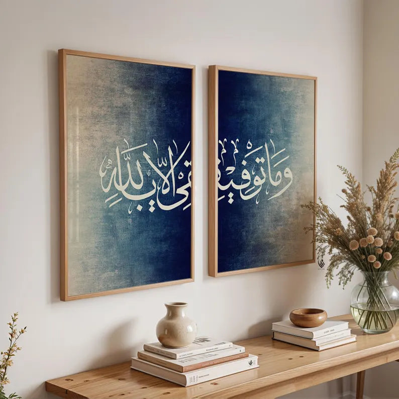 Apportez une touche spirituelle et élégante à votre intérieur avec cet ensemble de deux affiches murales islamiques, sublimées par une calligraphie arabe raffinée. Le verset coranique, finement tracé en blanc sur un fond dégradé bleu et doré, reflète à la fois sérénité et profondeur spirituelle.